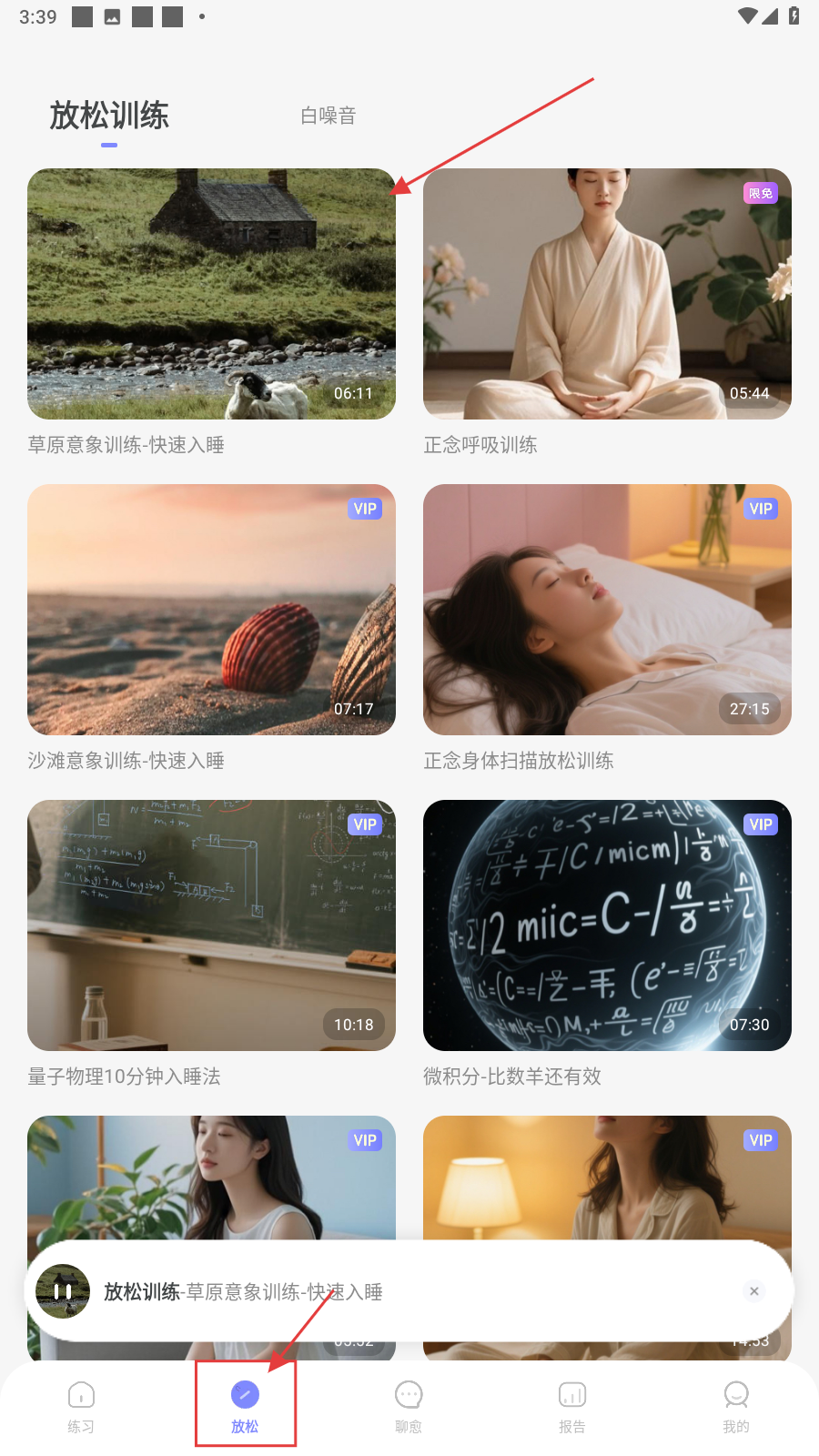 3、切换到【放松】页,选【草原意象训练-快速入睡】等课程,点击开始练习。