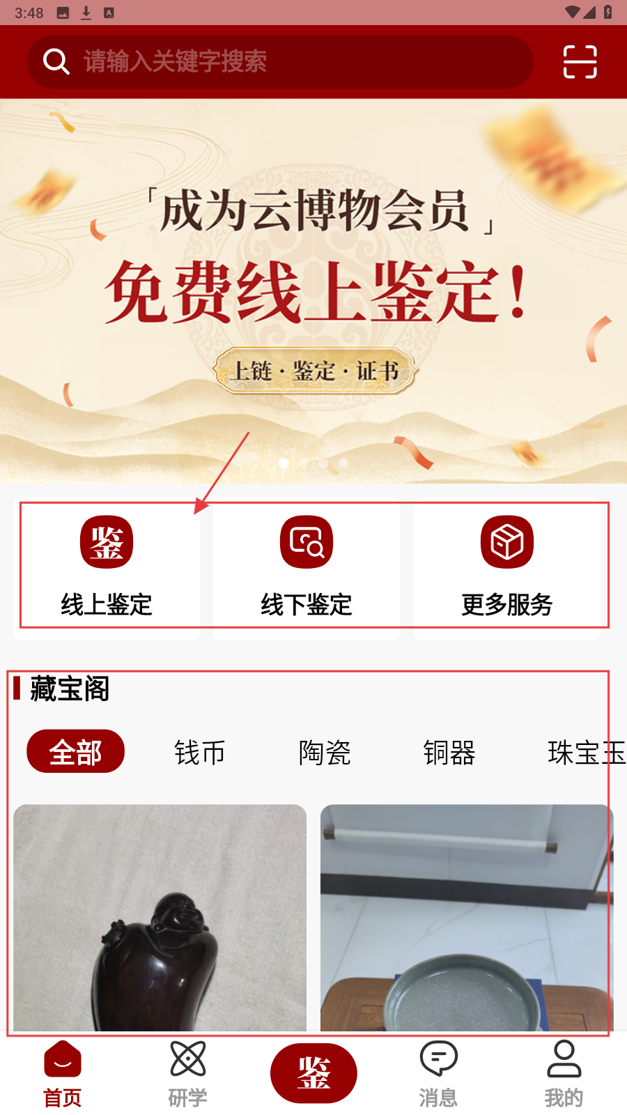 1、进入首页,按需选【线上鉴定】【线下鉴定】,开启藏品鉴定流程。