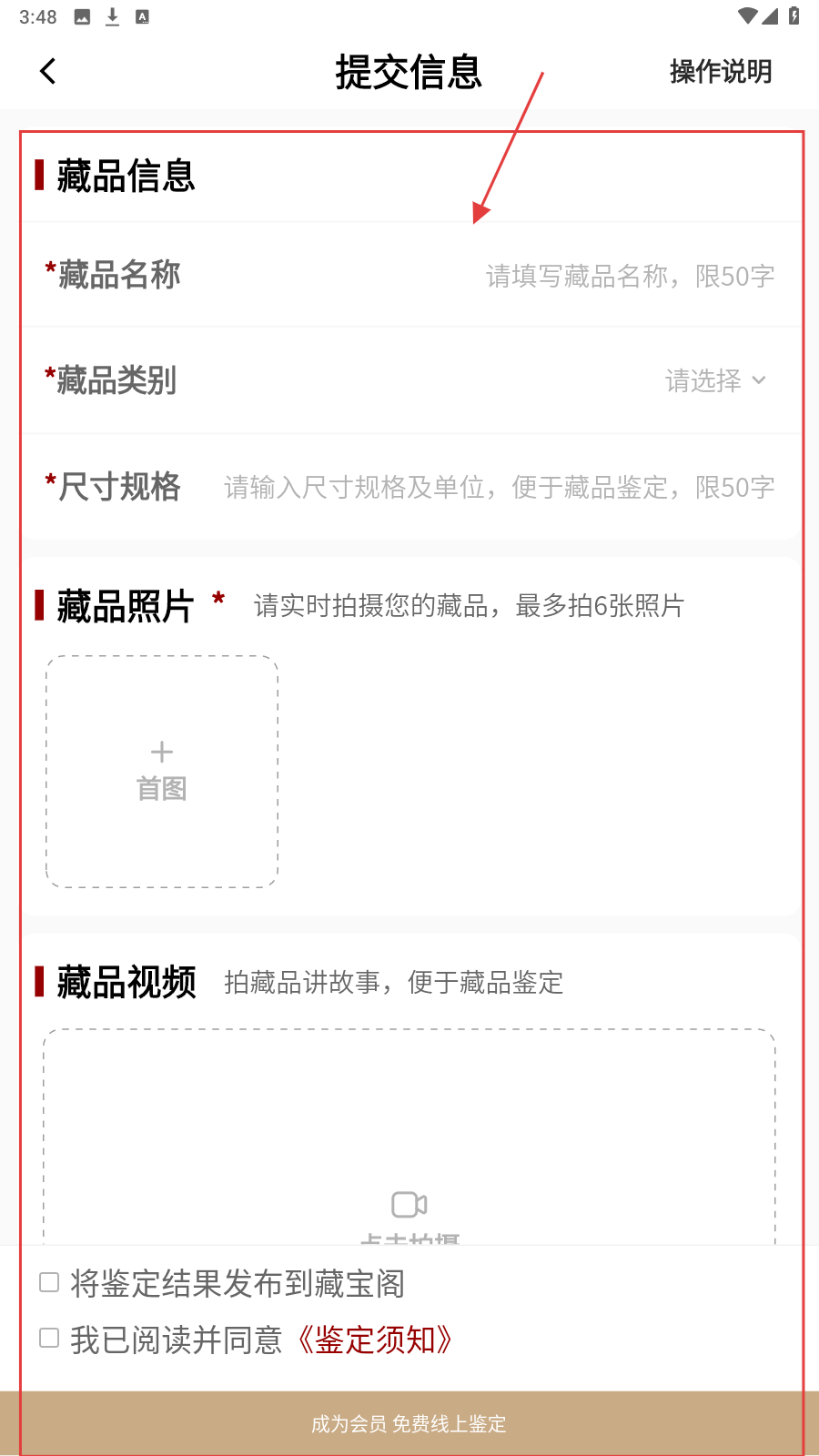 2、在【提交信息】页,填【藏品名称】【类别】等,传照片/视频提交鉴定。