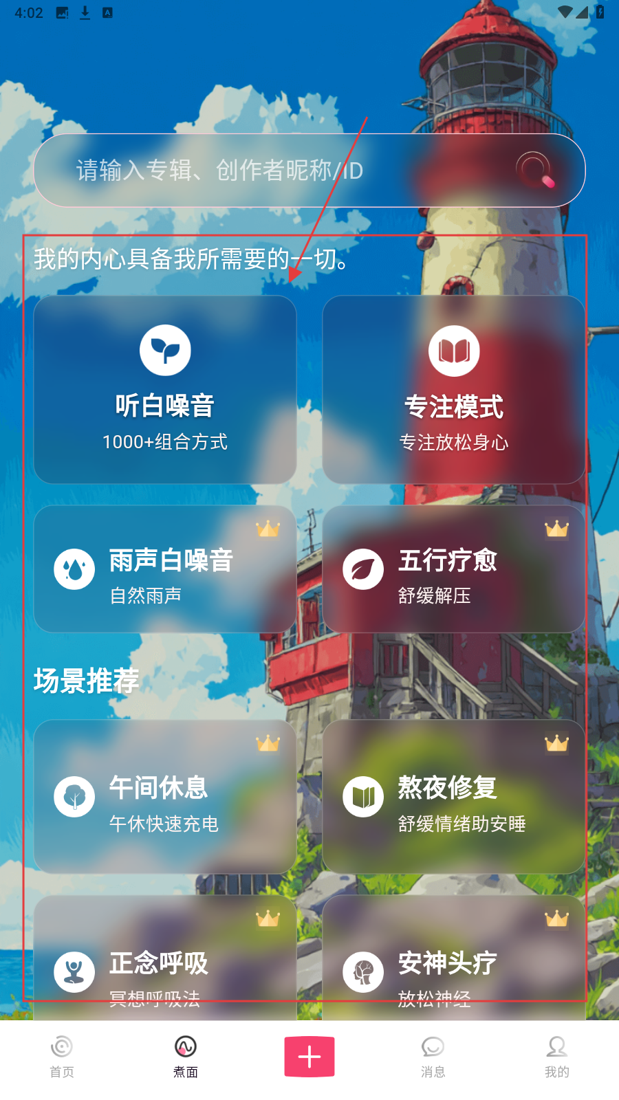 2、切换到【煮面】页,按需点【听白噪音】【专注模式】等功能放松。