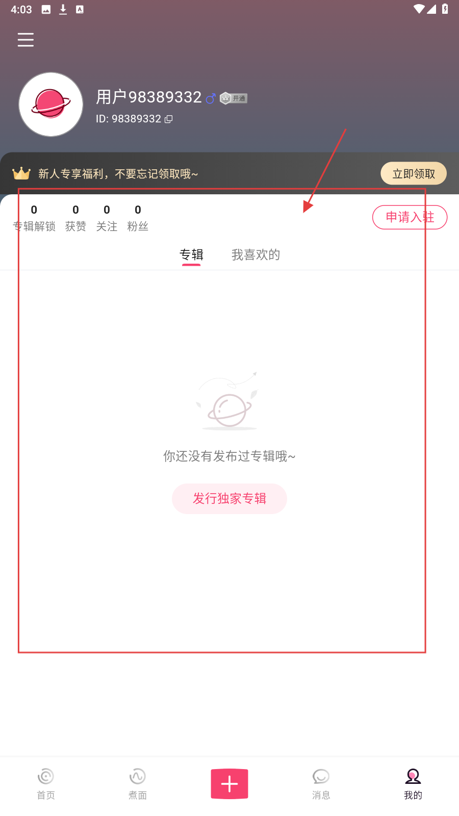 4、打开【我的】页,点【申请入驻】或【发行独家专辑】,参与内容创作。