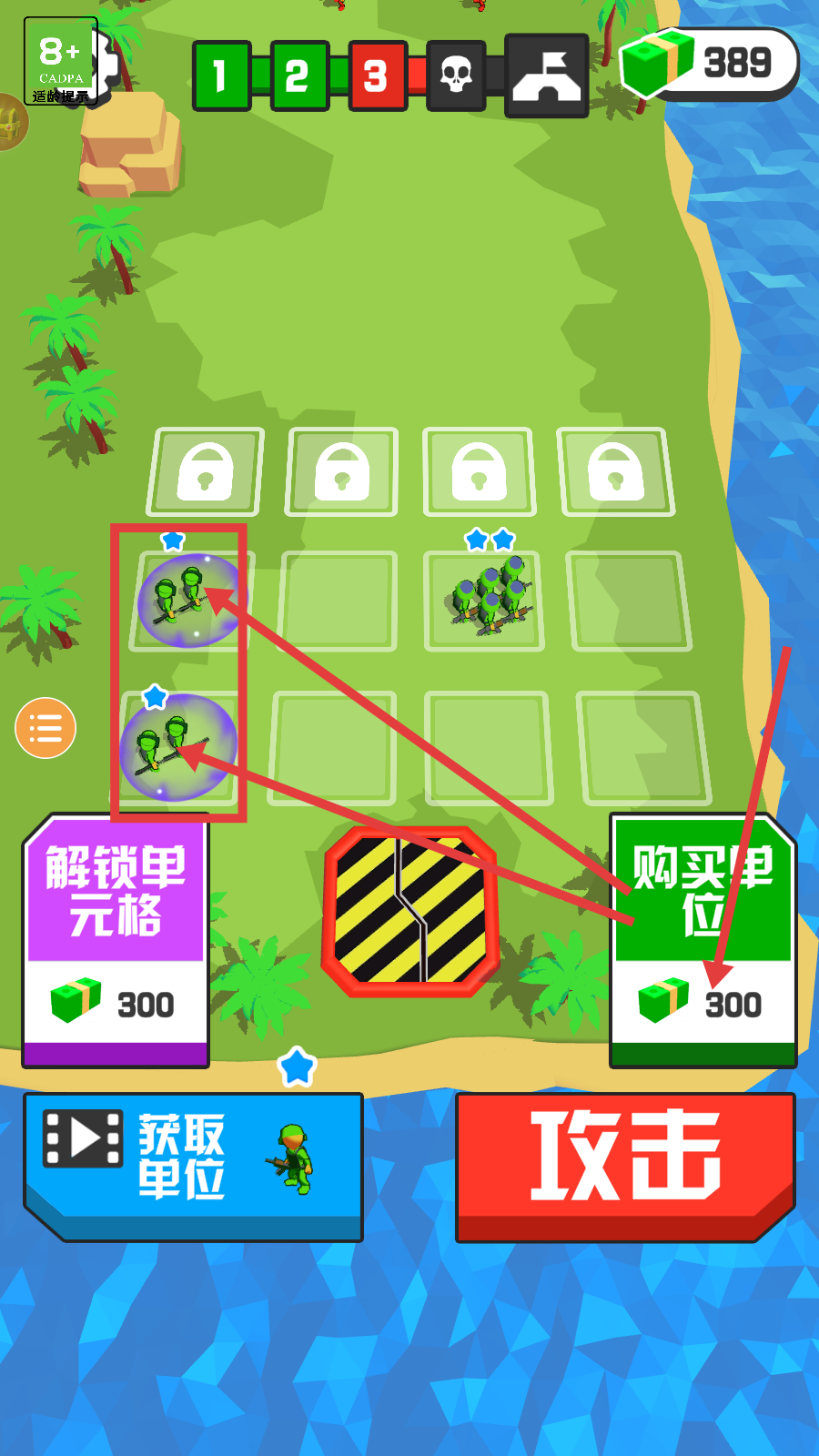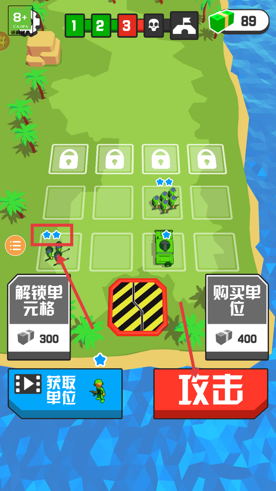 2、合并同星级士兵提升至二星,增强战力后点击【攻击】按钮,推进关卡挑战,扩大战场优势。