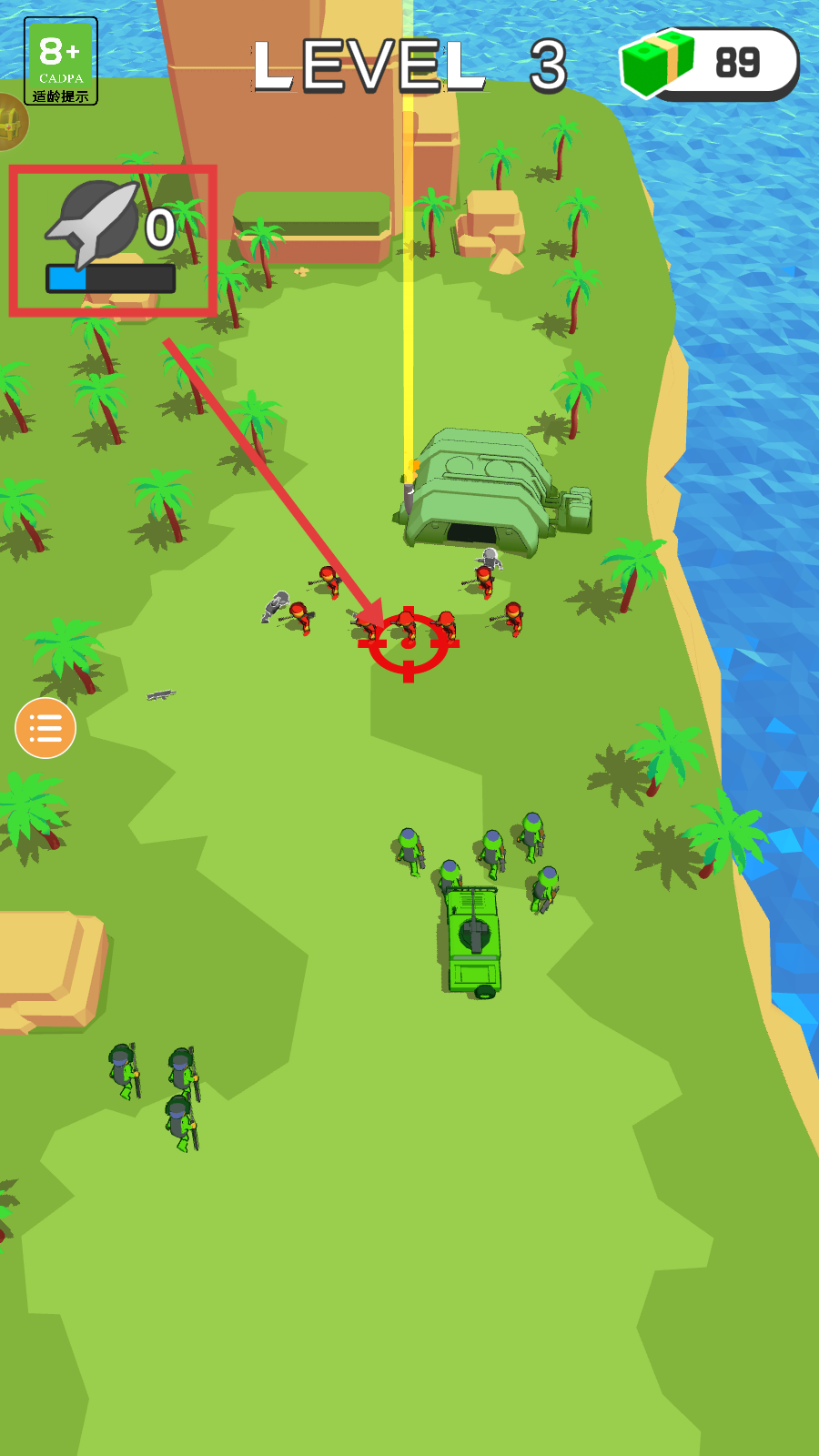 3、LEVEL3战斗中瞄准红色敌人集火,留意导弹资源(当前0),指挥绿色单位协同作战,快速清除敌群。