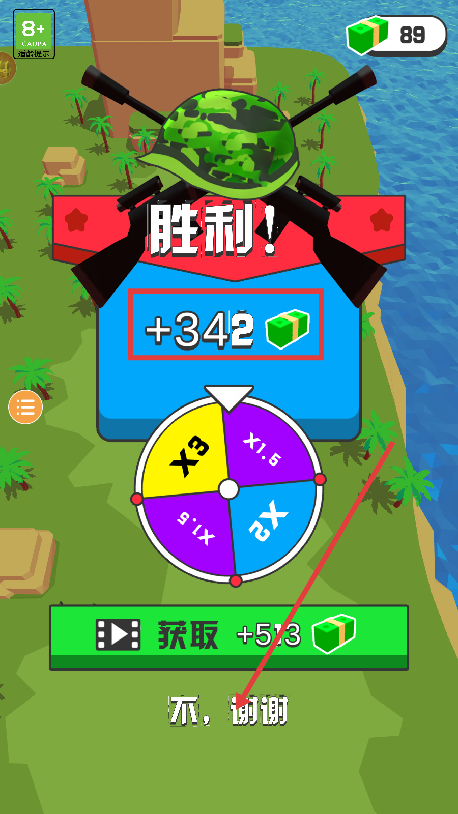 4、胜利后领取【+342】货币奖励,若无需翻倍奖励点击【不,谢谢】,节省时间继续下一关挑战。