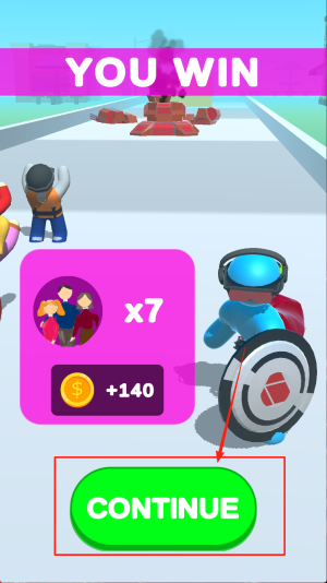 4、领取奖励:出现“YOUWIN x7 +140 CONTINUE”后,点击继续按钮,领取积分并进入下一关。
