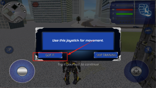 2、学习移动:看到“Use this joystick for movement. GOTIT SKIPTRAINING”时,拖动摇杆熟悉操作后点“GOTIT”。