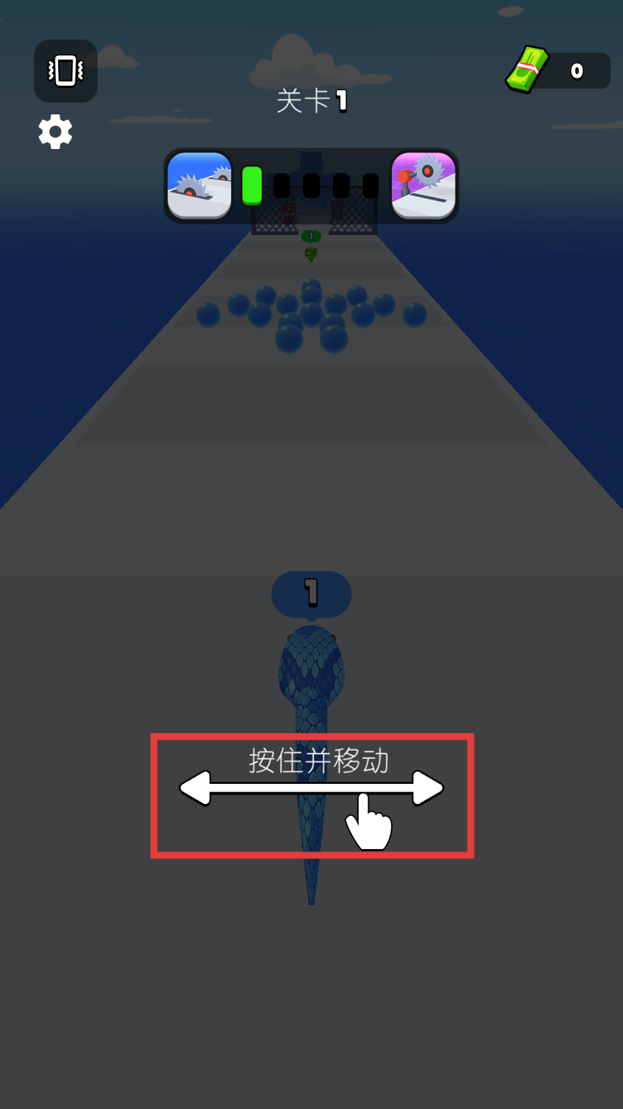 1、进入【关卡1】后,按提示【按住并移动】控制蛇,在路径上收集蓝色球体,开启冒险第一步。