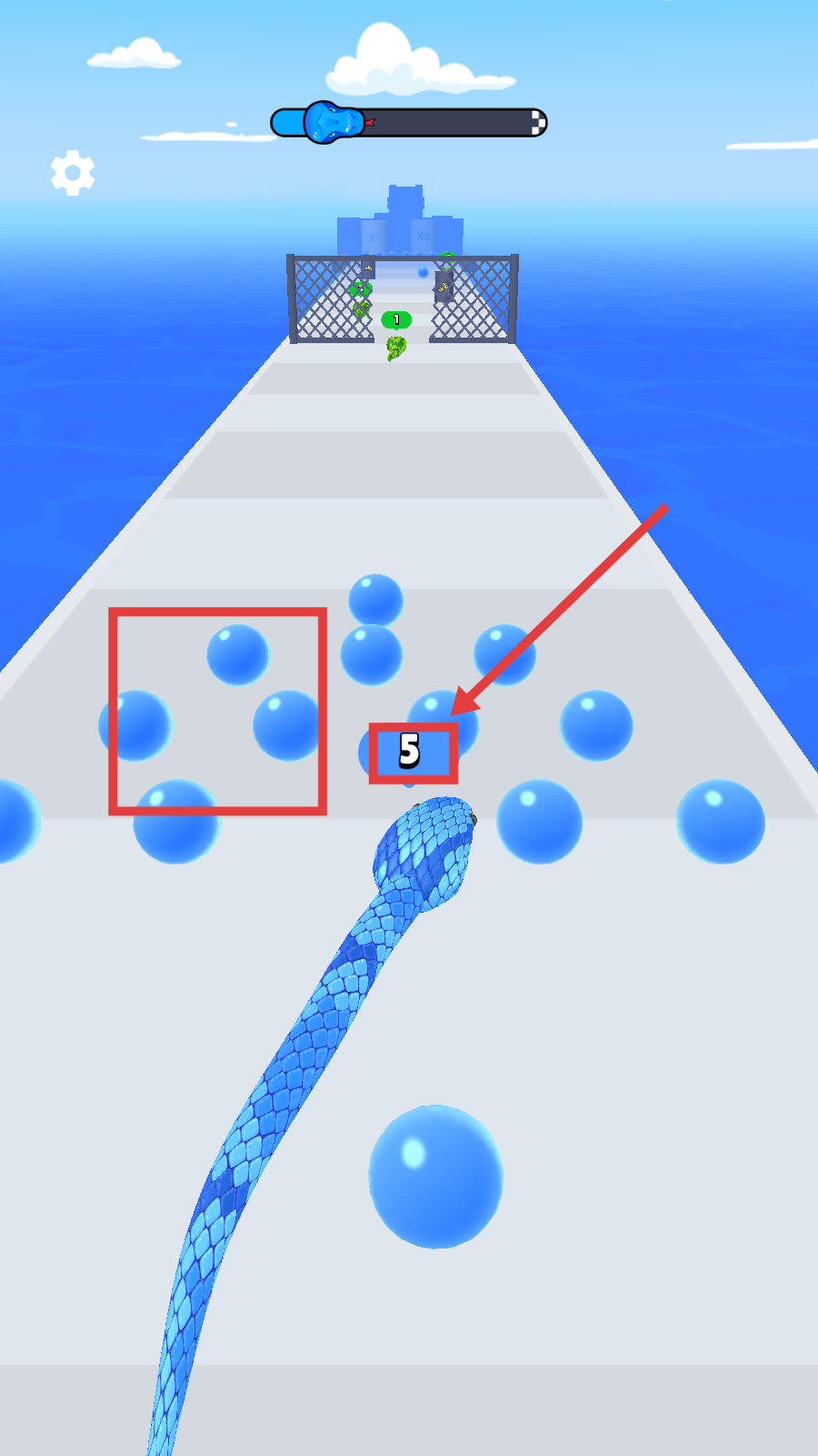 2、移动蛇身收集标有数字的球体,如【5】,让蛇长度增加,为后续吃小蛇和通关积累基础。