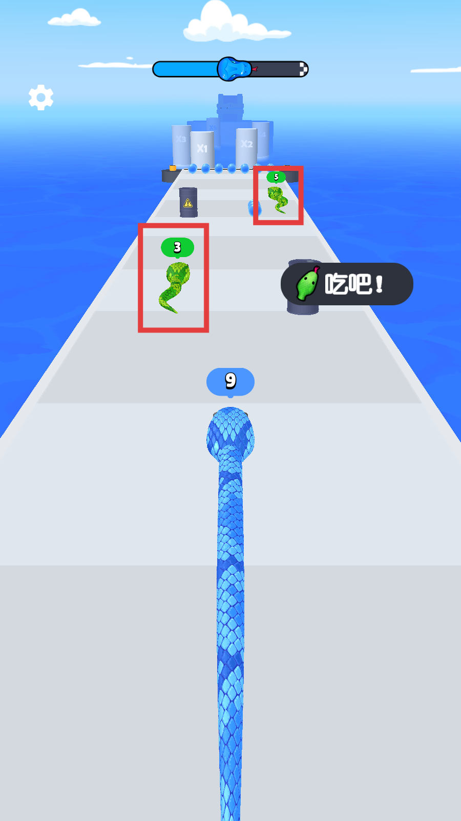 3、遇到标有【3】和【5】的绿色小蛇,按提示【吃吧!】吃掉它们,快速提升蛇的长度,推进关卡进程。