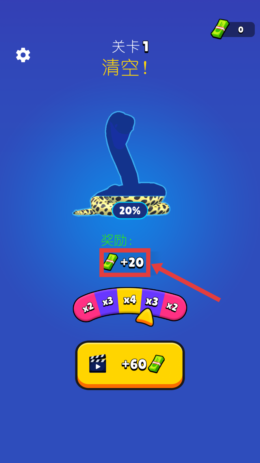 4、完成【关卡1】后显示【清空!】,获得【+20】钞票奖励,也可看广告得【+60】,积累货币用于后续强化。