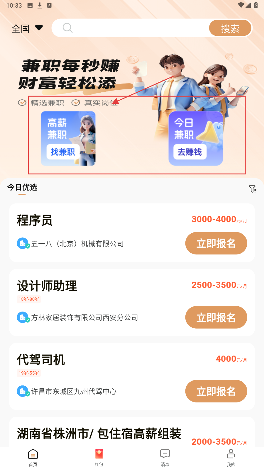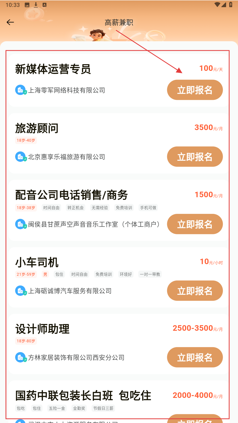 2、在【高薪兼职】页面,查看招聘信息,选择心仪的招聘信息点击【立即报名】。