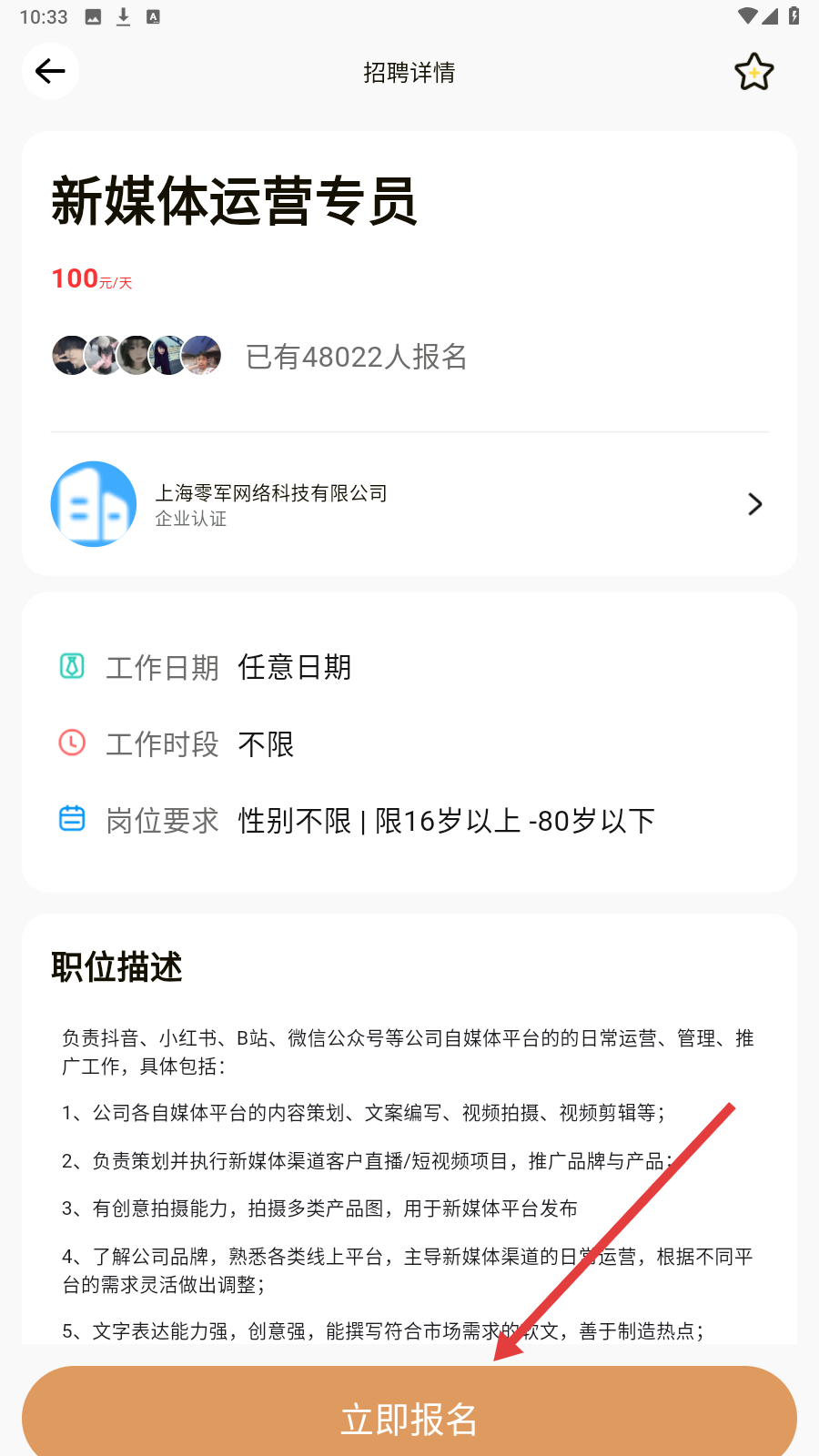 3、在【招聘详情】页面,了解职位要求,如若感兴趣点击【立即报名】。
