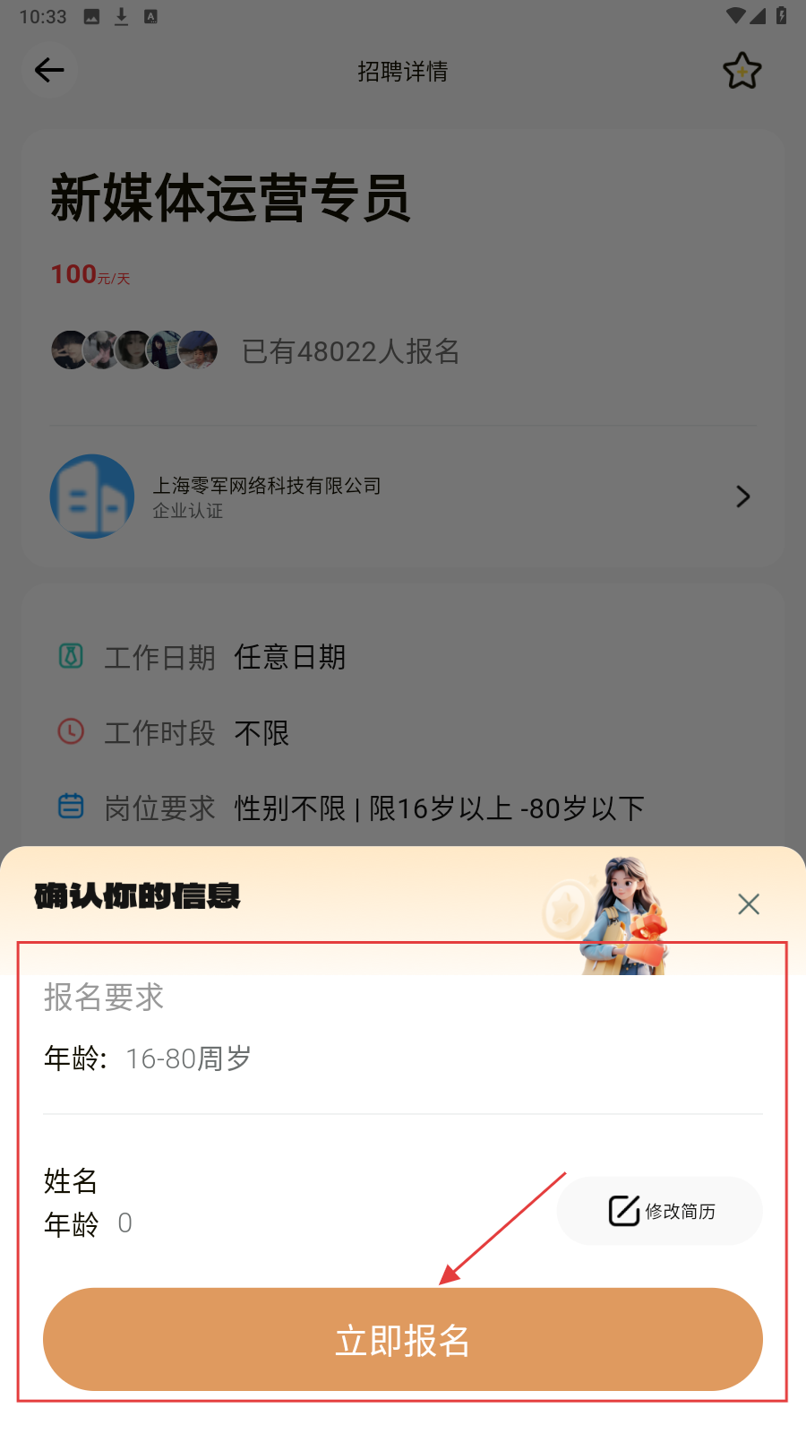 4、点击后在【确认你的信息】弹窗中填写信息,点击【立即报名】即可。