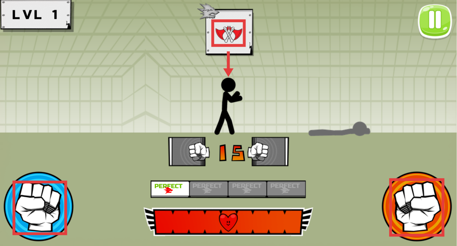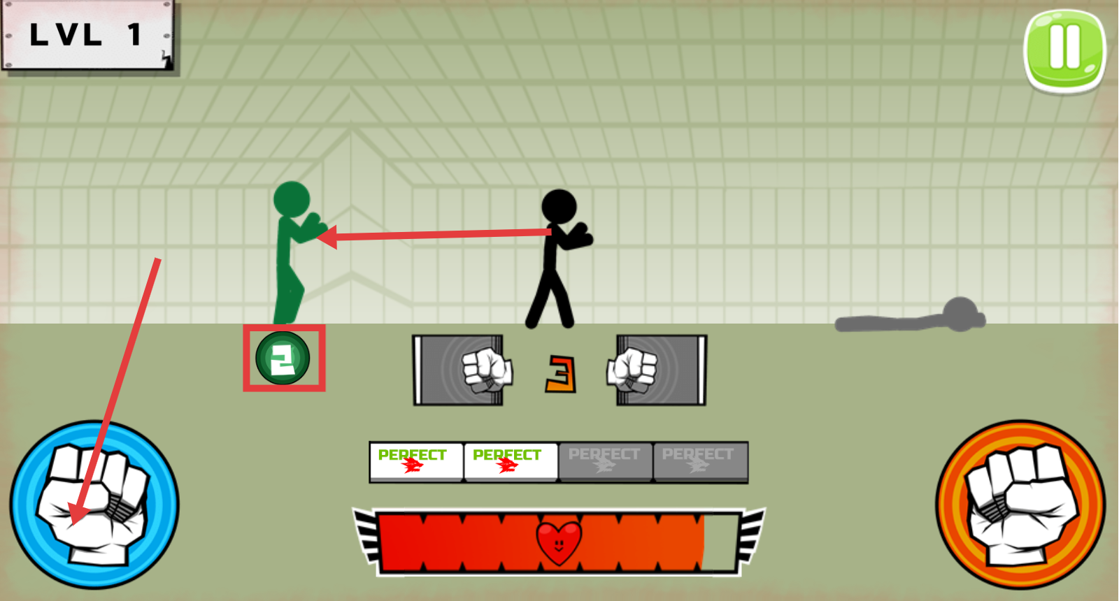 2、在【LVL-1】战斗时,按左右拳头按钮攻击,积累【PERFECT】评价提升战斗效率。