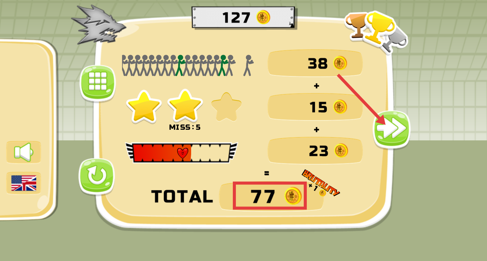 4、关卡结束看结算,总金币【77】含加分项,点绿色箭头继续下一关积累更多奖励。