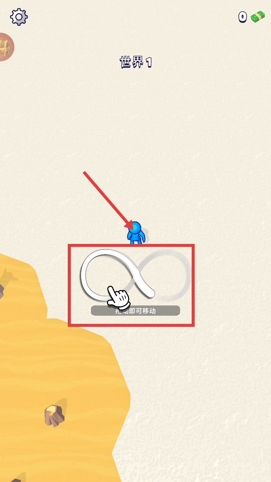 1、进入【世界1】后,按提示【拖动即可移动】操控蓝色角色,开启冒险探索之旅。