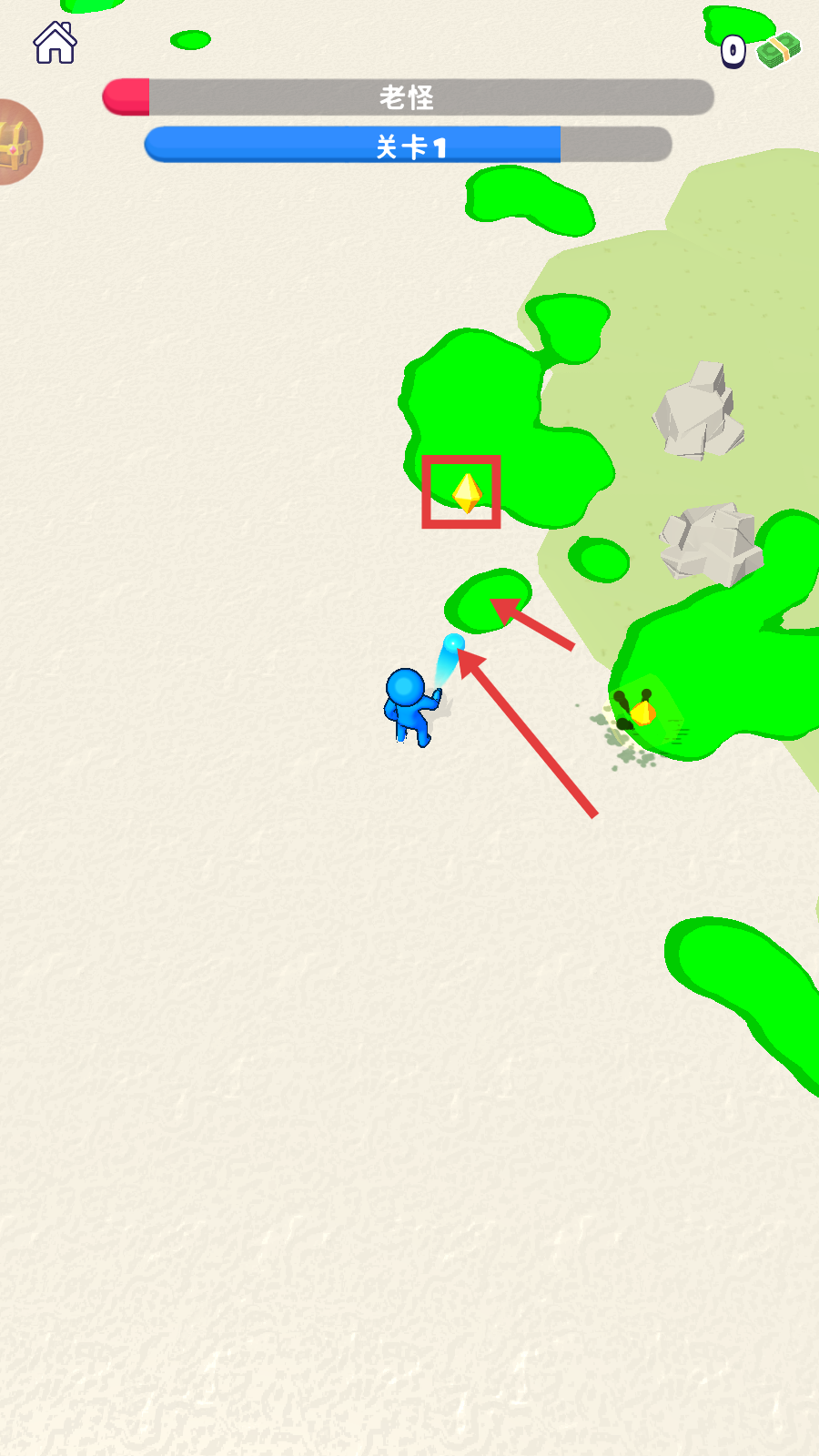 2、在【关卡1】中,引导角色前往绿色区域,收集黄色菱形道具,推进关卡进程提升进度。