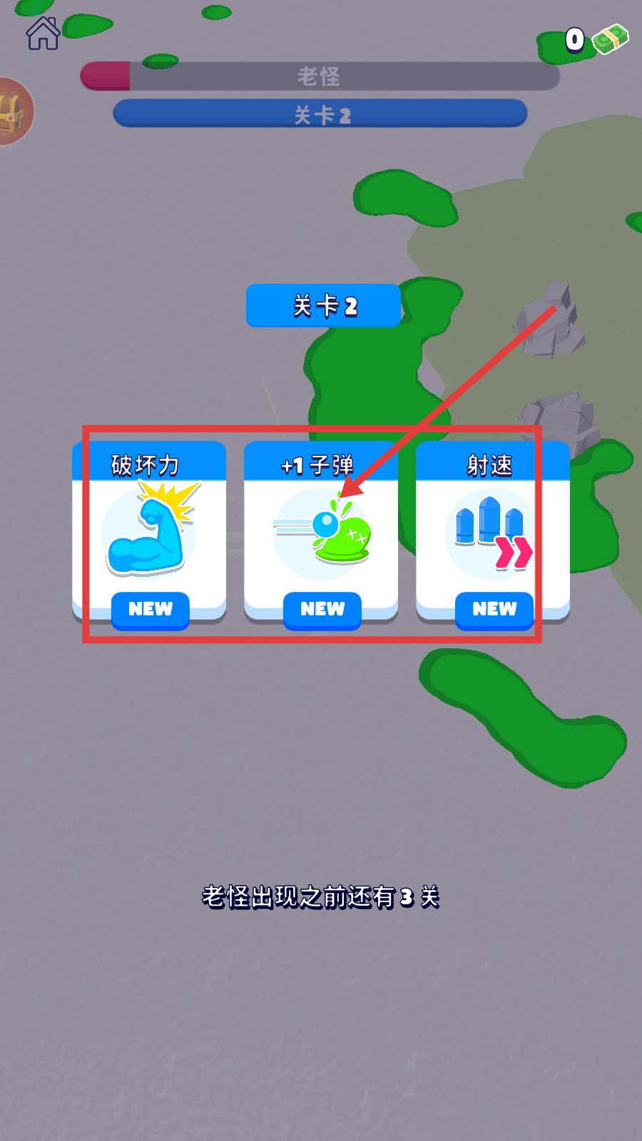 3、抵达【关卡2】后,可选【破坏力】【+1子弹】【射速】增益强化角色,助力后续战斗闯关。