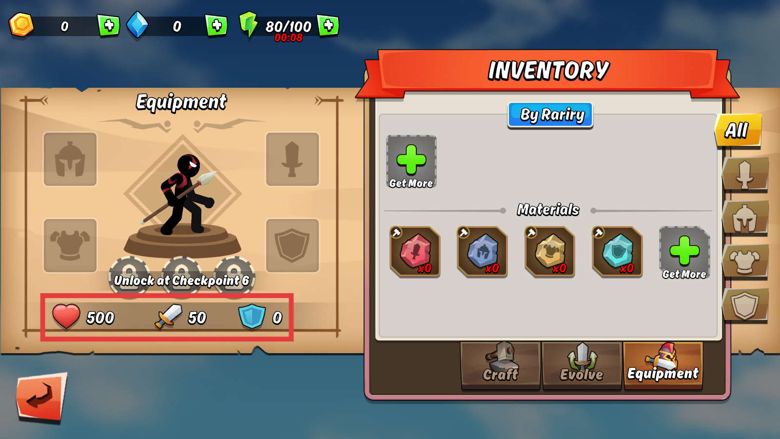 1、在装备界面关注【生命值-500】【攻击力-50】等属性,收集材料为装备制作进化做准备,提升角色战力。