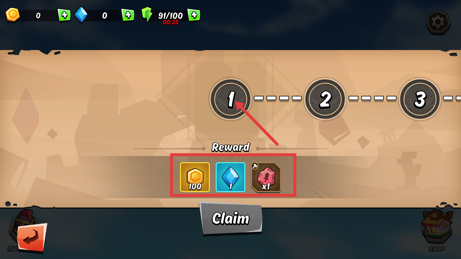 2、完成阶段1后领取【金币-100】【钻石-1】【红水晶-x1】奖励,积累资源用于角色强化与装备养成。