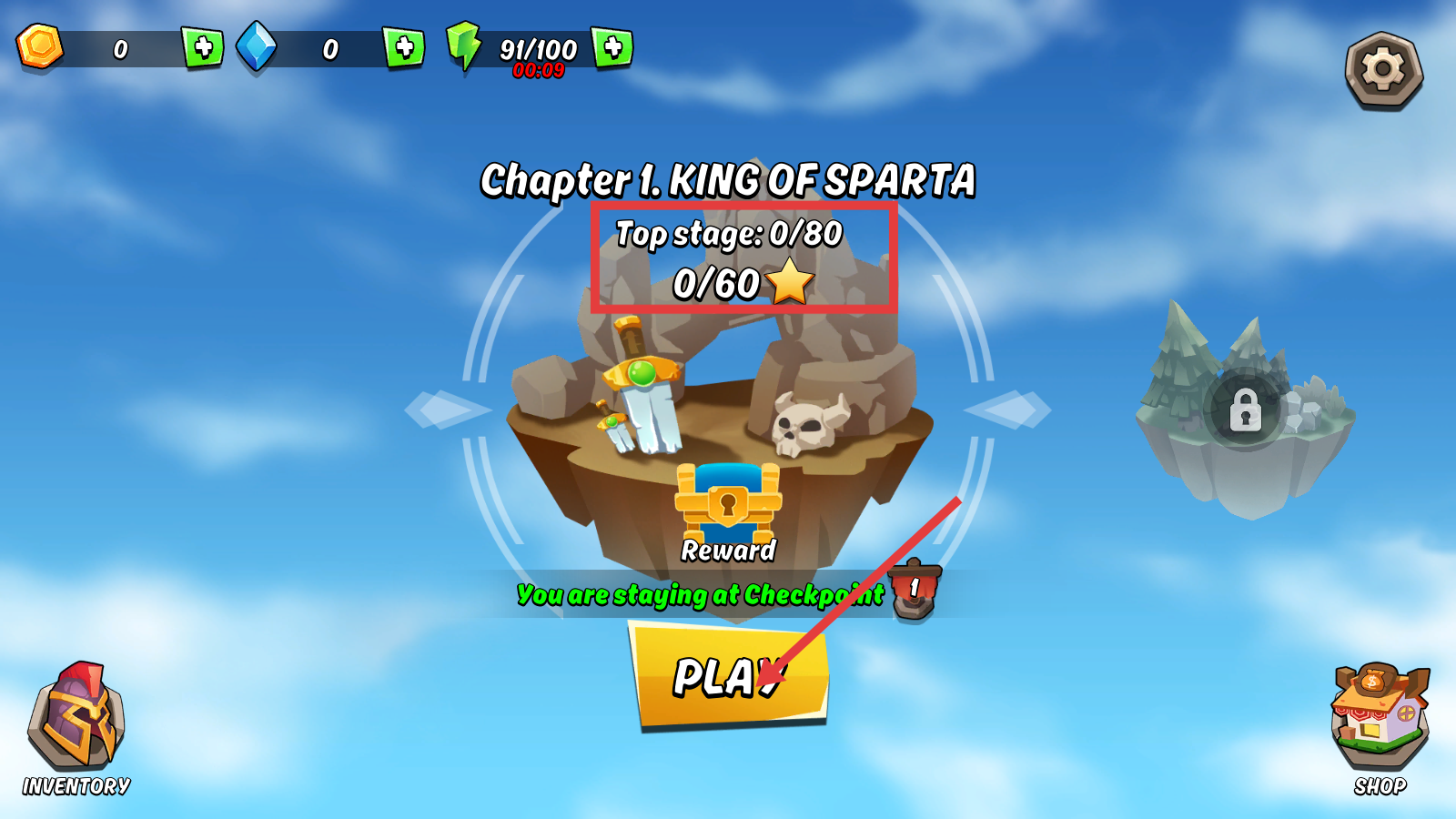3、进入【Chapter-1.KING-OF-SPARTA】,目标【Top-stage-0/80】与【0/60★】,点击【PLAY】推进关卡收集星星。