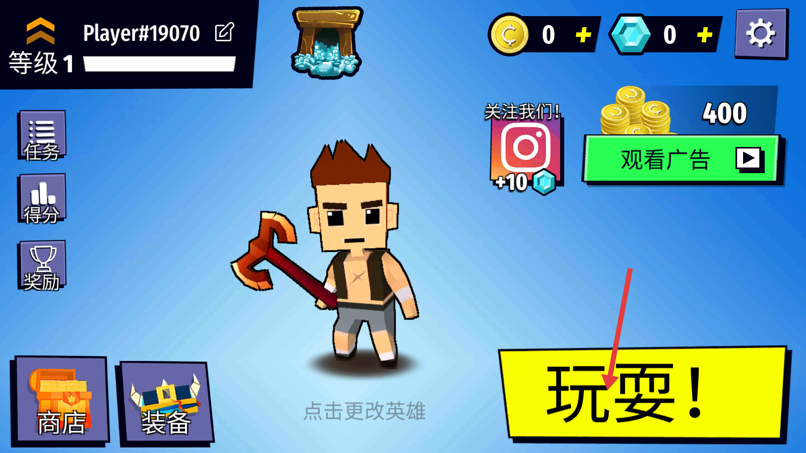 1、在等级1界面点击【玩耍!】进入游戏,可前往【商店】【装备】页面筹备,开启对战前先熟悉功能。