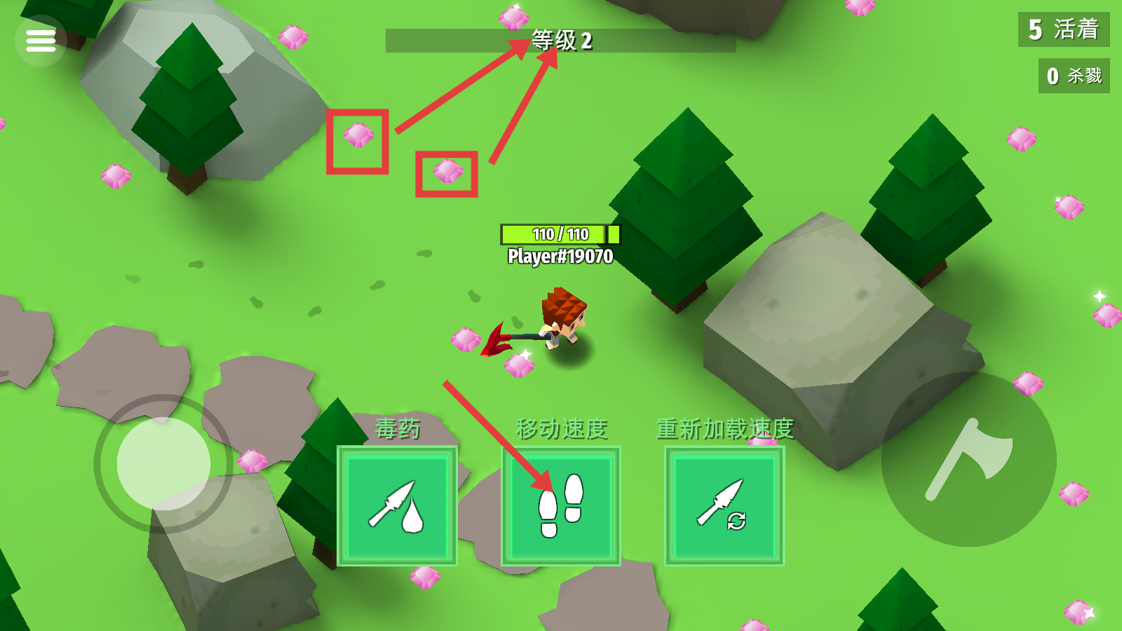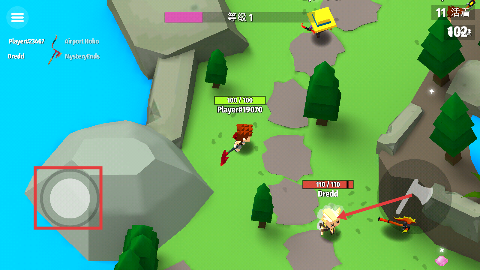 2、战斗时左侧摇杆操控移动,点击斧头图标攻击敌人,留意【11-活着】人数,在场景中收集资源提升等级。