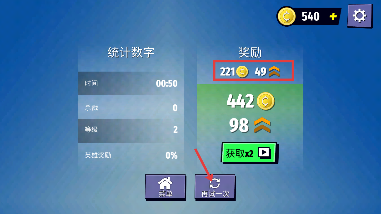 4、结算时获取【221-金币】【49-经验】,若想刷取更优成绩点击【再试一次】,积累资源强化角色能力。