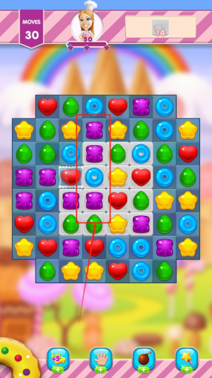 2、匹配相同消除:将两个颜色和形状相同的糖果移动到一起,或把同色果冻碰撞成组,最少三个相连即可消除,积累消除数量。