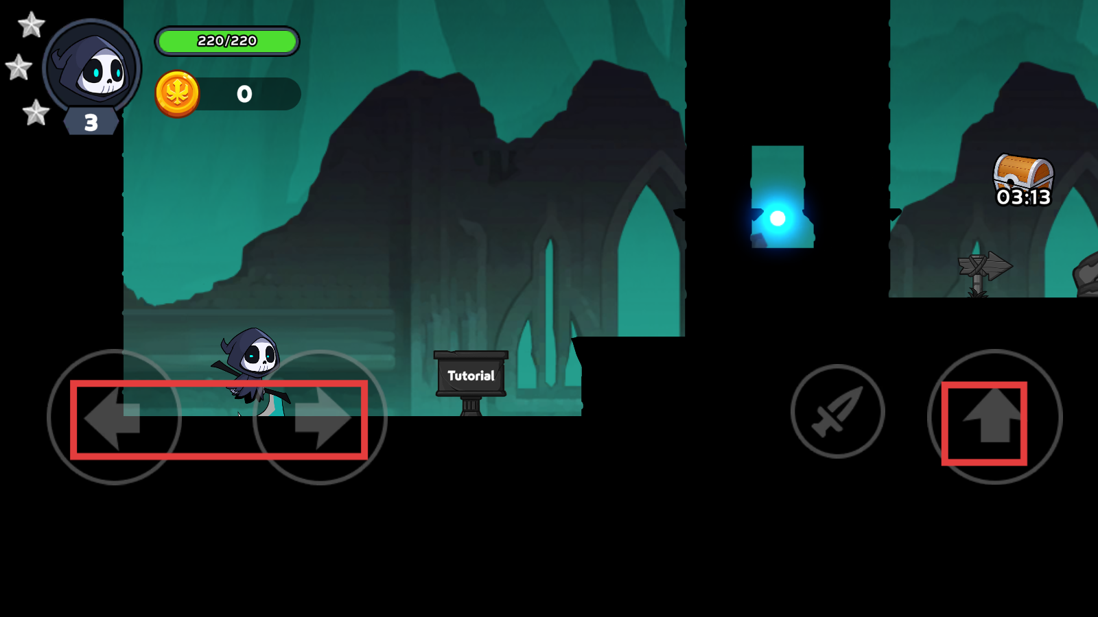 1、操控角色用【左右箭头】移动、【向上箭头】跳跃,靠近【Tutorial】区域完成初始教程,熟悉基础操作流程。