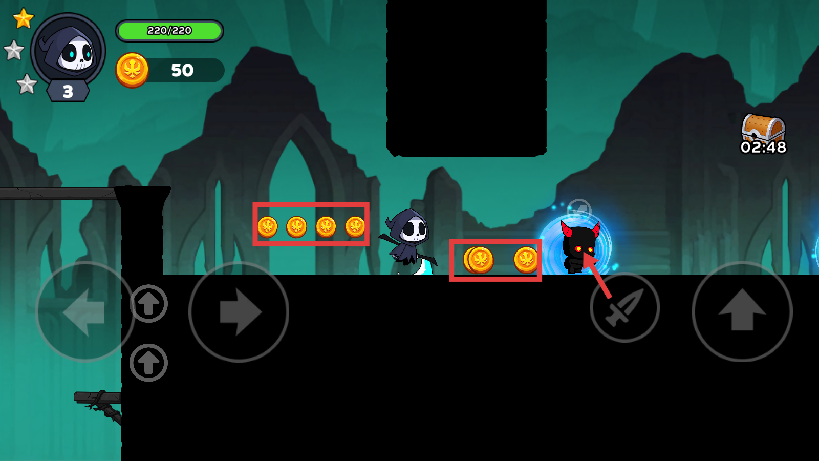 3、遇到【金币】群优先收集,遭遇【小恶魔】敌人时,点击【匕首】图标发动攻击,积累资源强化角色。