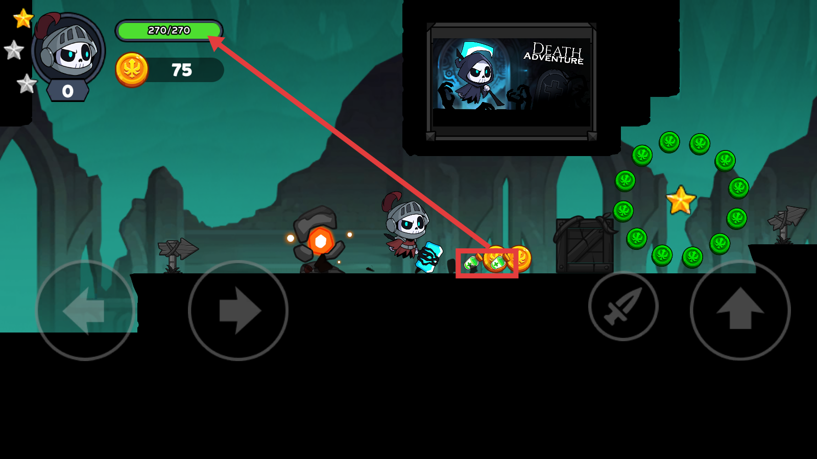 4、收集【绿色血瓶】可提升生命值至【270/270】,完成阶段后解锁【骑士】形态,推进【DEATH-ADVENTURE】剧情。