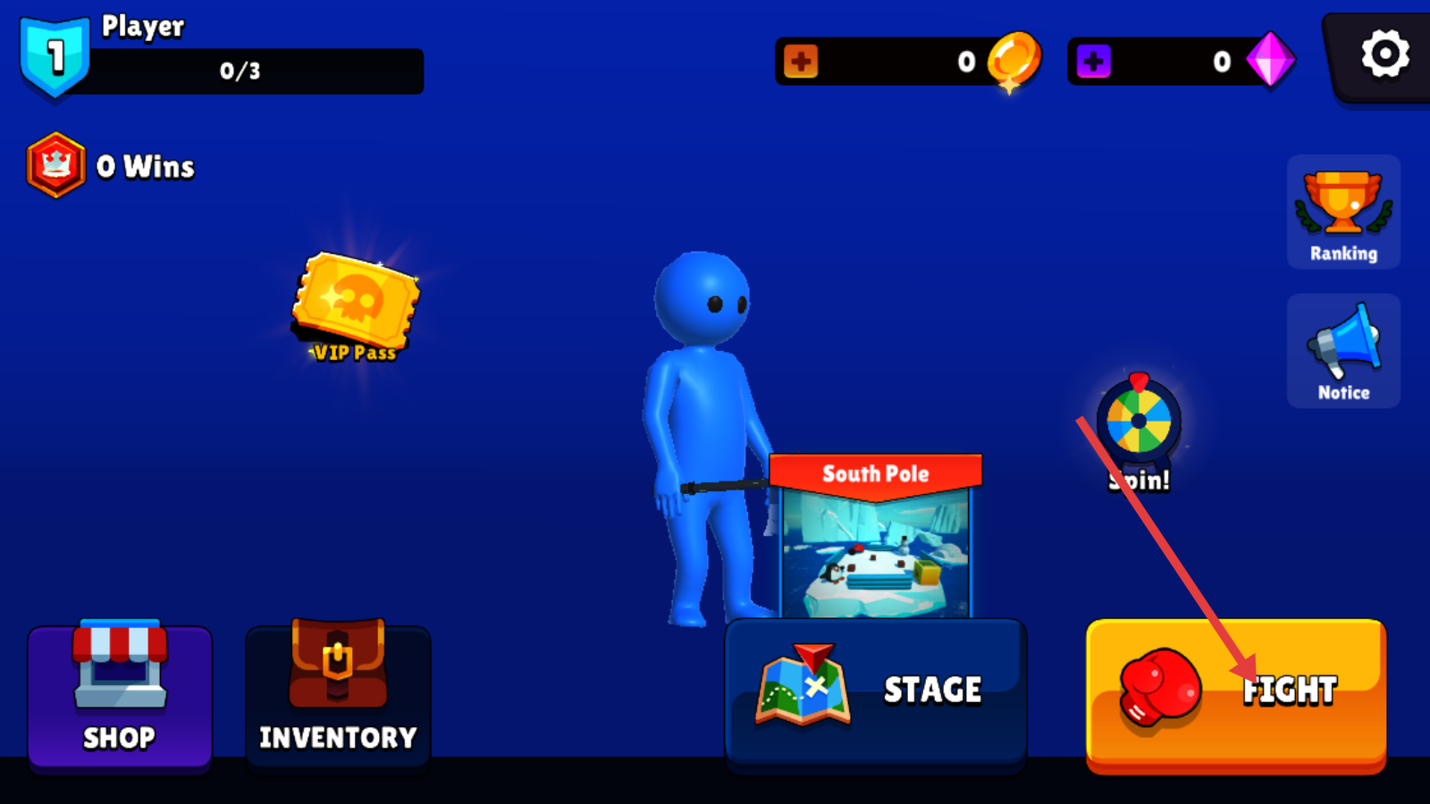 1、进入游戏主界面后,点击橙色【FIGHT】按钮,选择【SouthPole】场景,开启极地战斗之旅,快速投入对战。