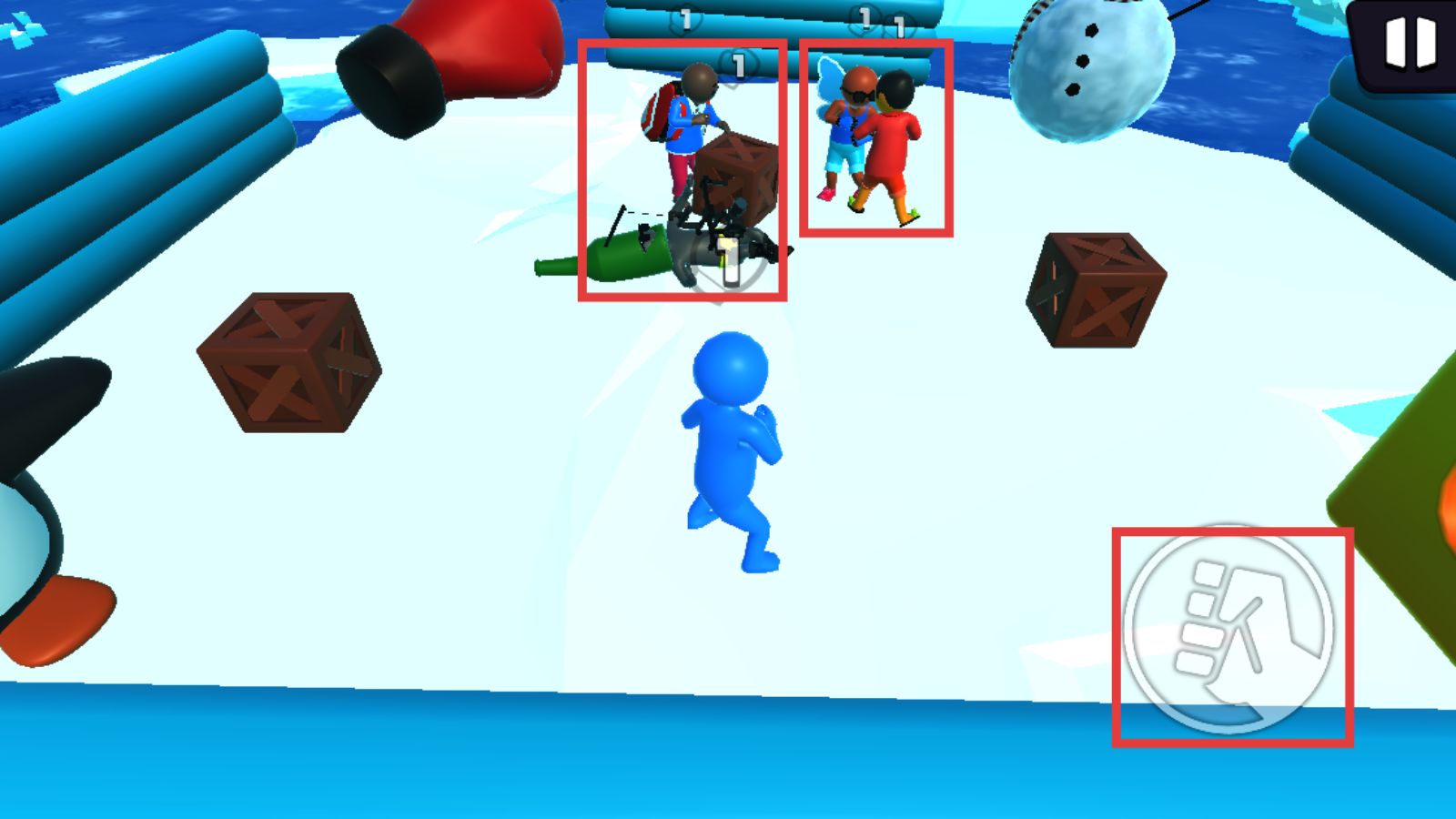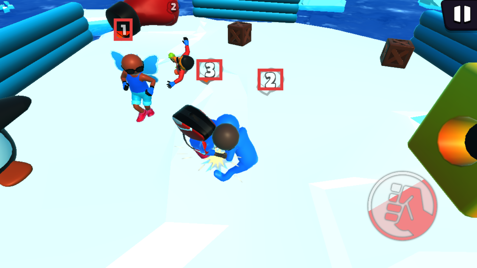 2、战斗中用虚拟摇杆移动角色,靠近敌人时点击右下角【拳头按钮】发动攻击,优先击破木箱获取道具。
