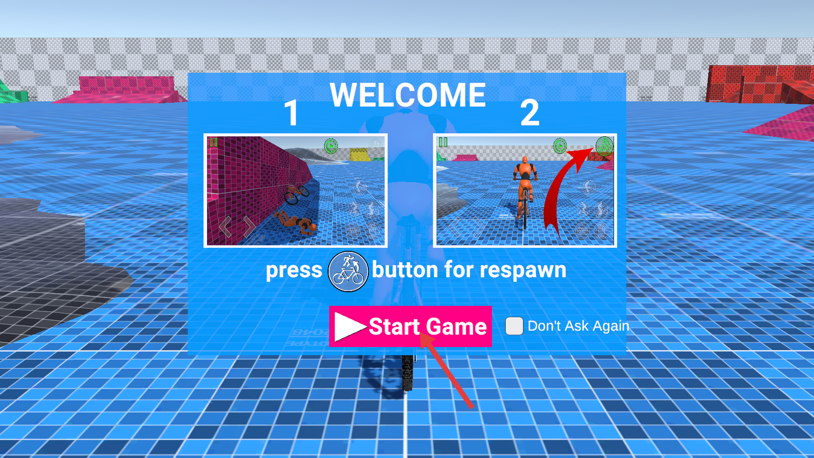 1、进入游戏点击【Start-Game】,熟悉【press-自行车按钮-for-respawn】机制,选择模式后开启骑行挑战。