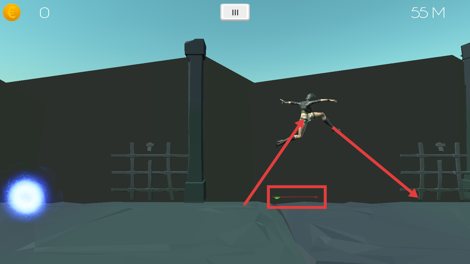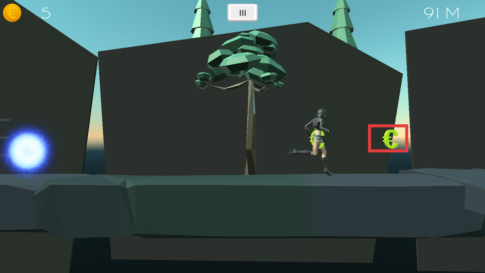 2、跑酷中优先收集【€】符号积累金币,留意右上角距离数值,尽可能延长奔跑里程。
