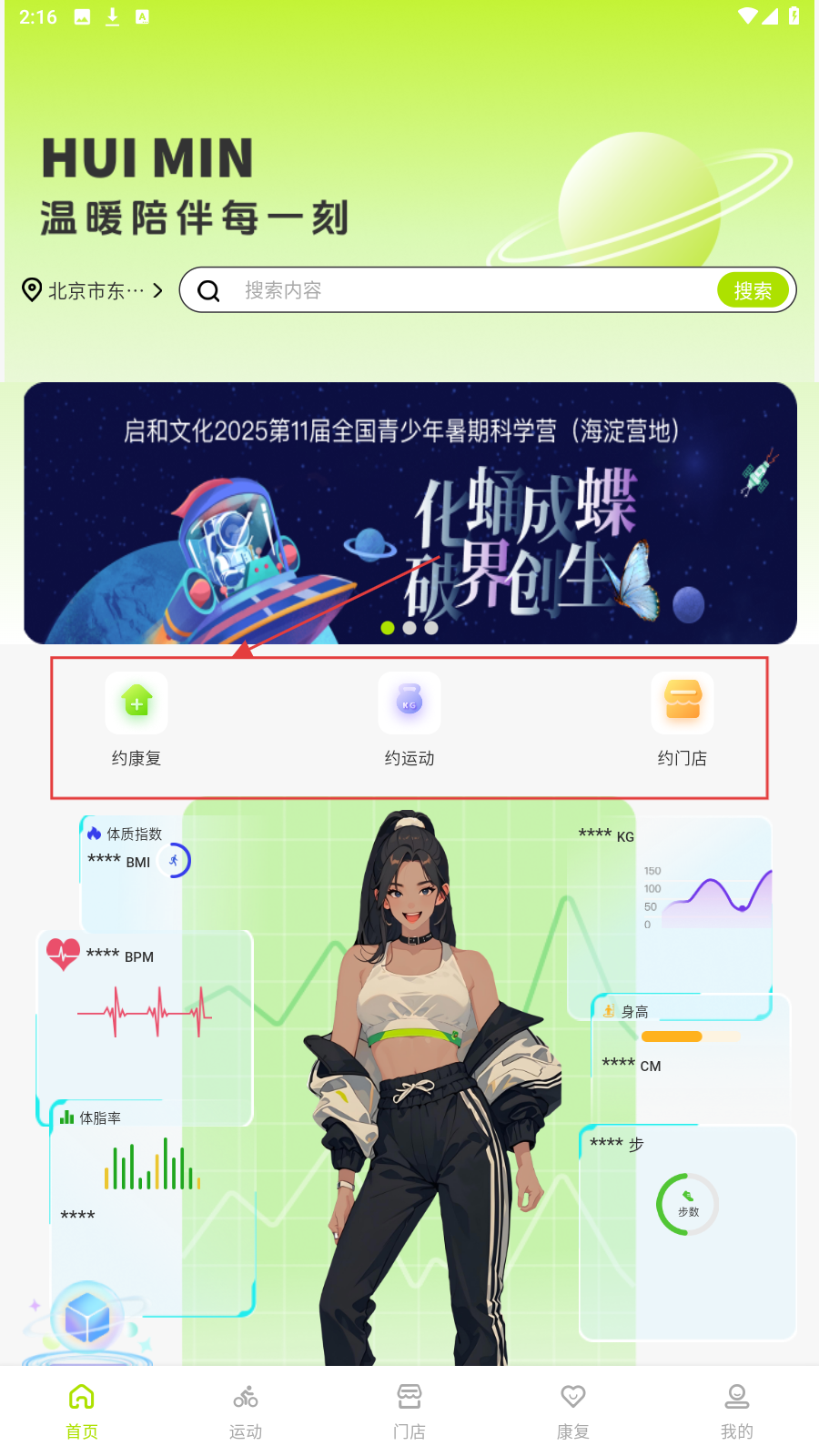 1、打开APP首页,找到【约康复】入口,点击进入康复预约服务选择页面。