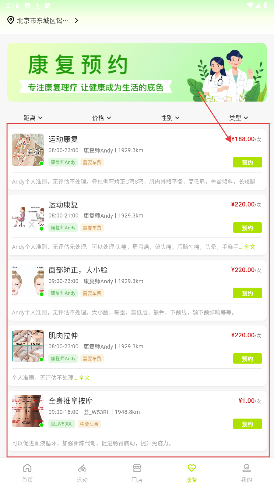 2、在康复预约列表,筛选【运动康复】等服务,查看价格与详情,准备预约。