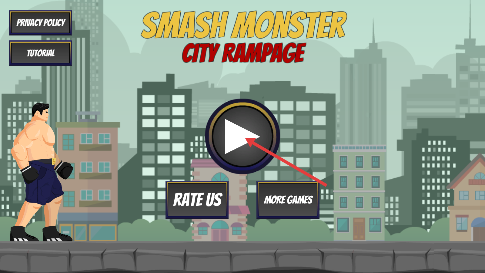 1、点击【SMASH-MONSTER-CITY-RAMPAGE】中央的开始按钮进入游戏,也可先查看【TUTORIAL】熟悉操作。