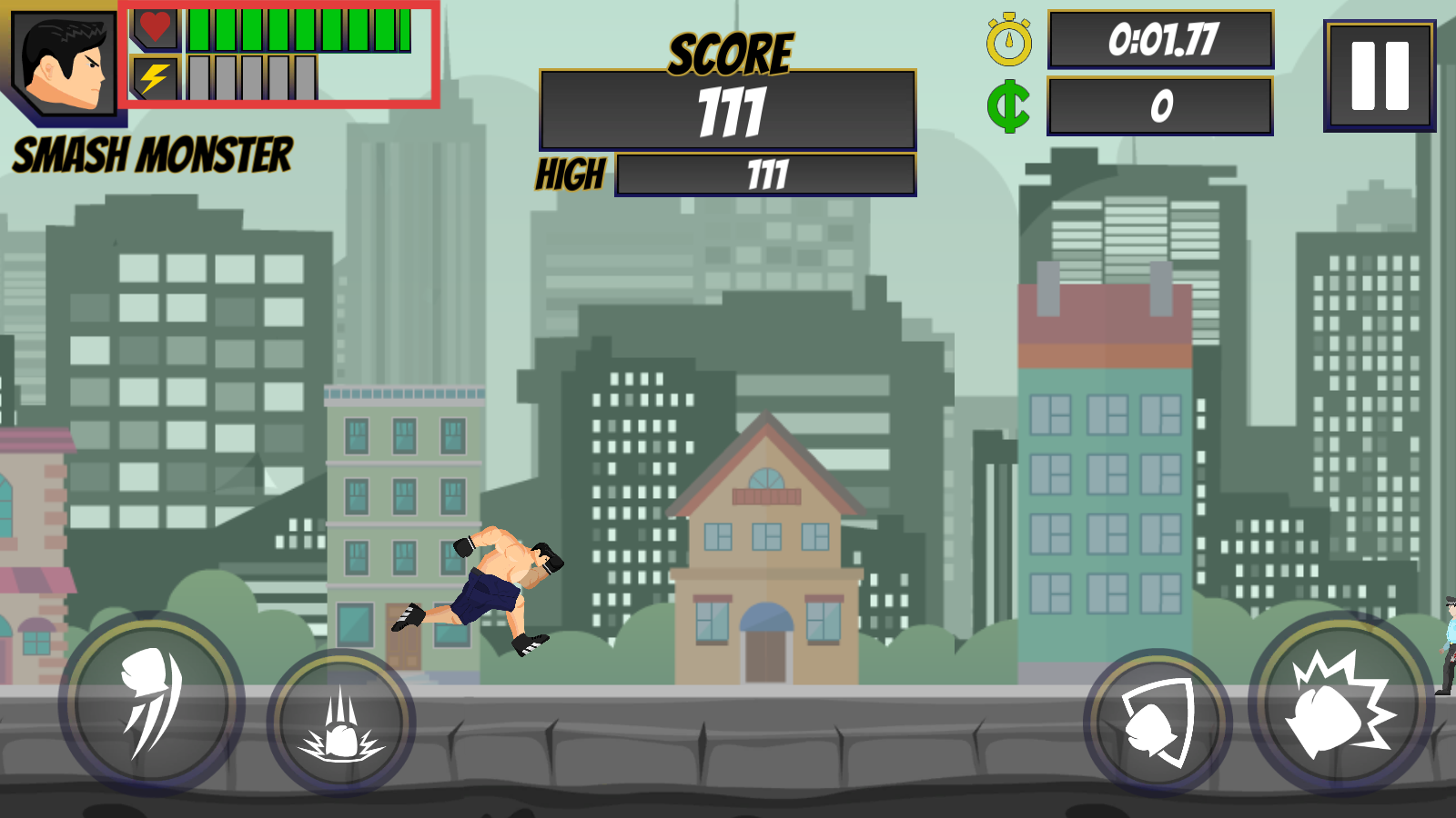 3、利用底部技能按钮,攻击建筑与敌人,快速积累【SCORE】和金币,推进游戏进程。