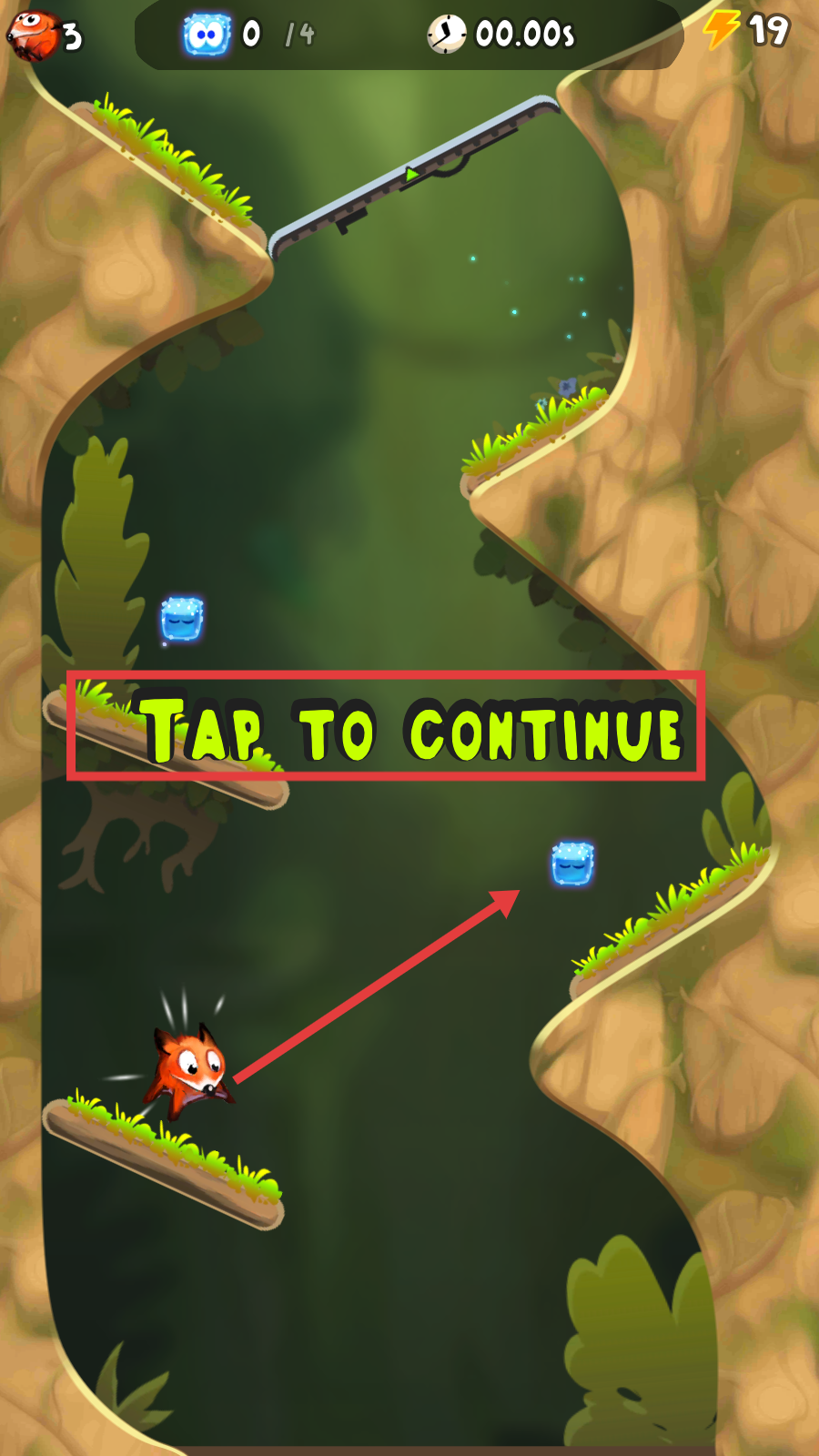 2、出现【TAP-TO-CONTINUE】时点击屏幕,操控狐狸角色移动收集蓝色方块推进关卡进度。