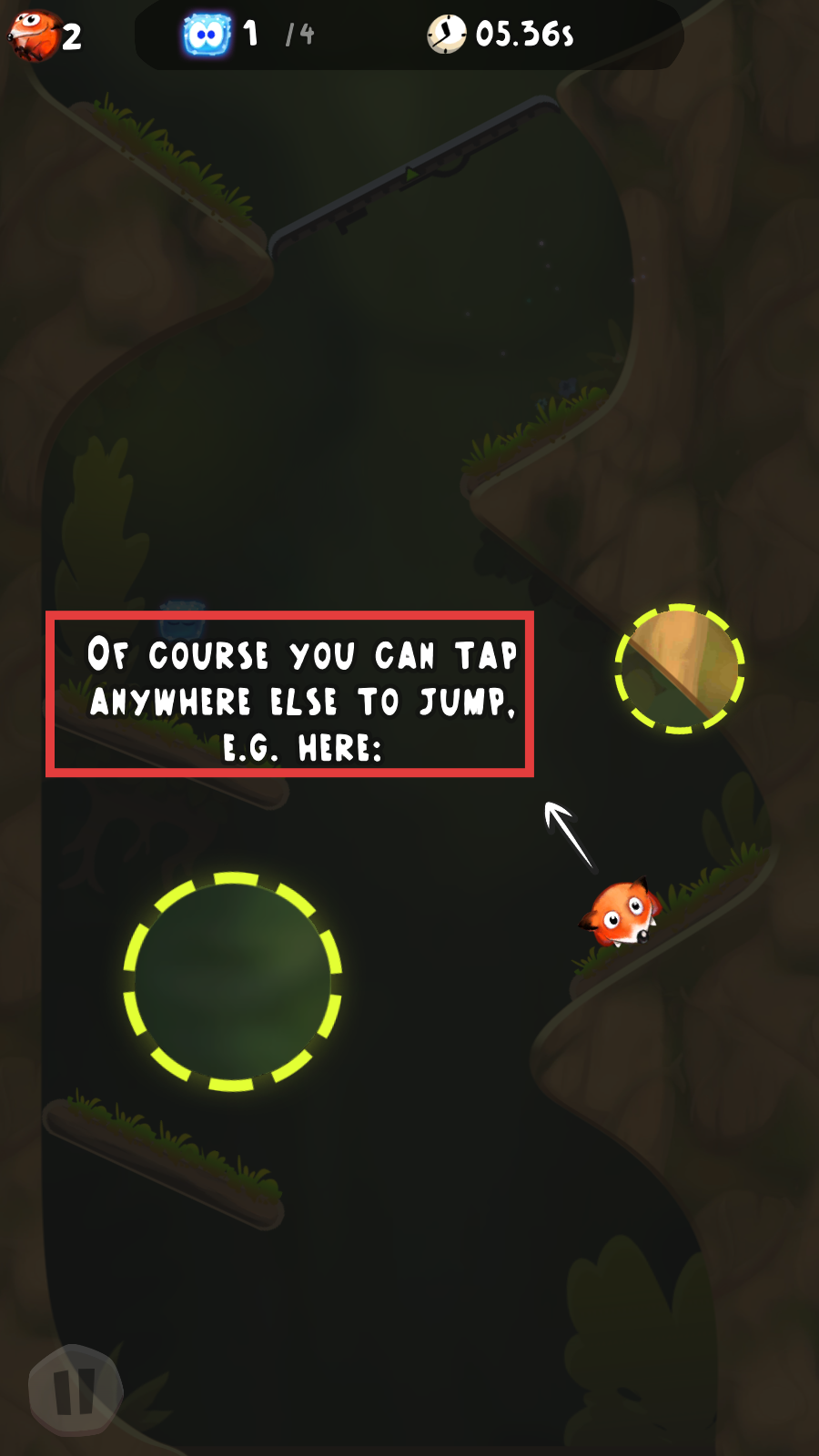 3、按提示【OF-COURSE-YOU-CAN-TAP-ANYWHERE-ELSE-TO-JUMP,-E.G.-HERE:】点击屏幕让角色跳跃过光圈。
