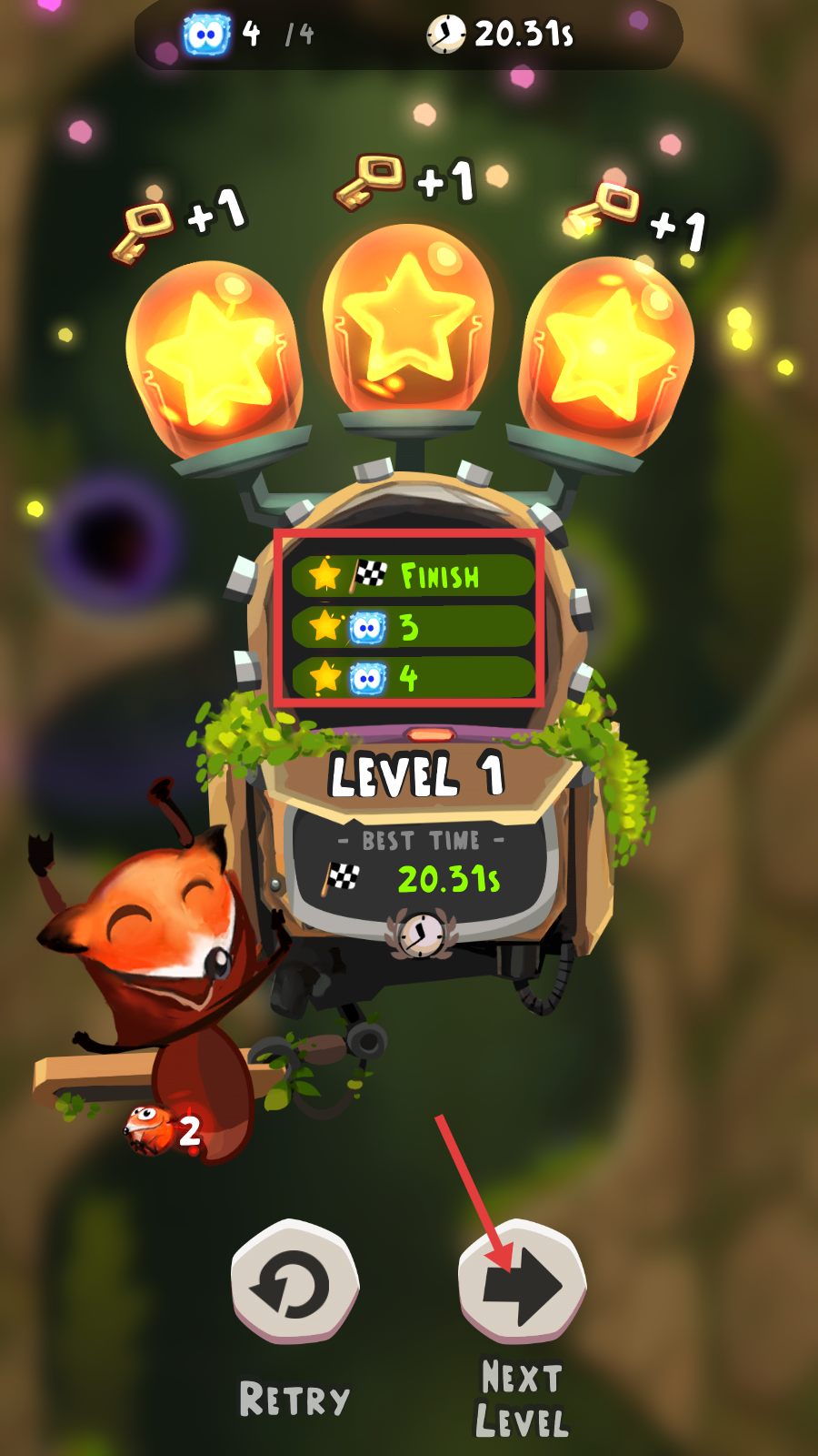 4、通关【LEVEL-1】后点击【NEXT-LEVEL】进入下一关,争取延续三星评价积累关卡进度。