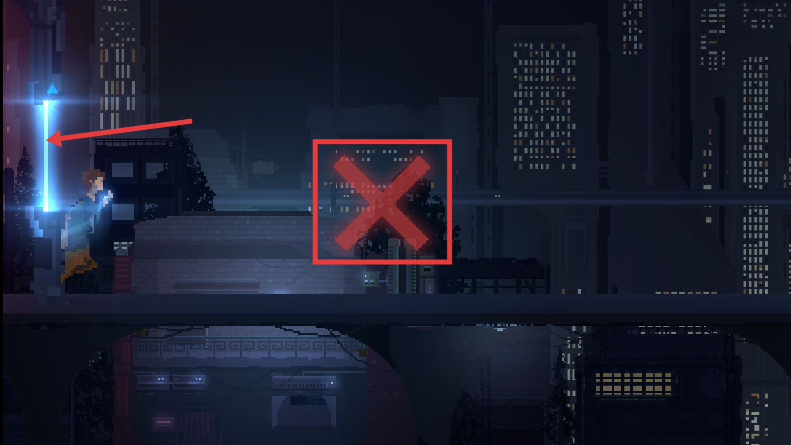 4、跑酷时需要上滑触碰蓝色光柱,操纵失误会出现红叉的警告,同时注意场景机关推进关卡进程。