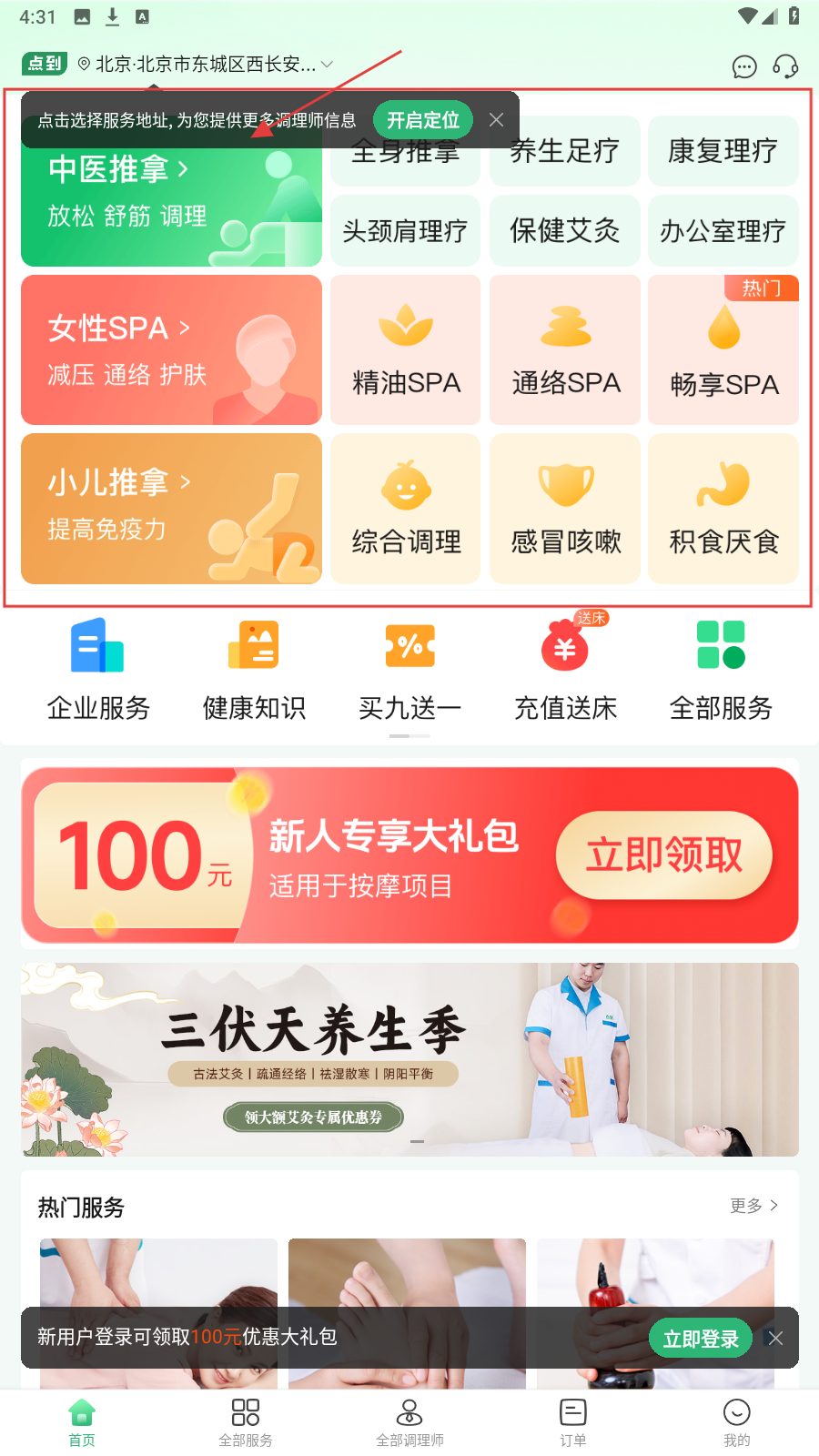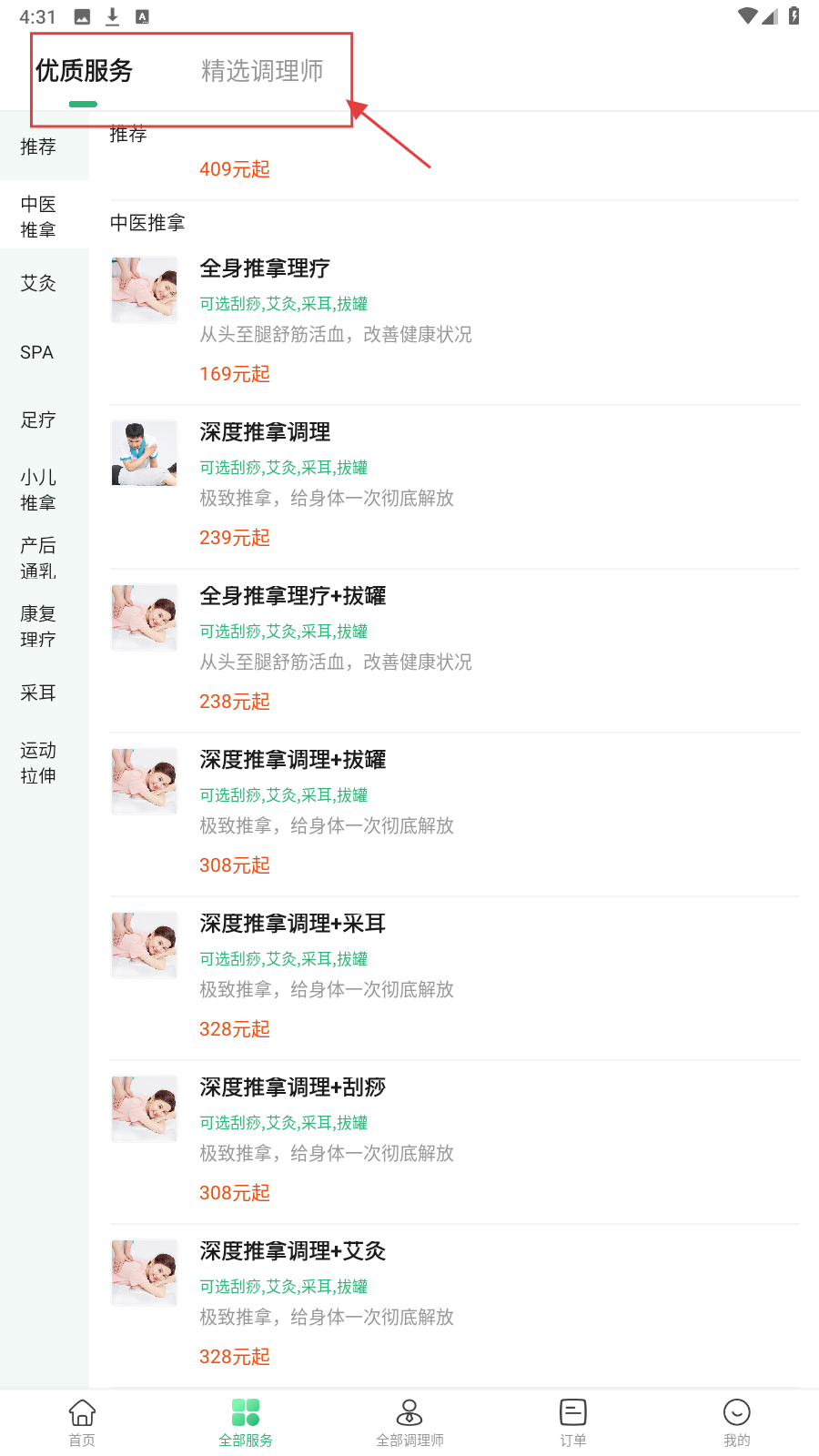 2、在【全部服务】页,切换【优质服务/精选调理师】,找心仪按摩项目。