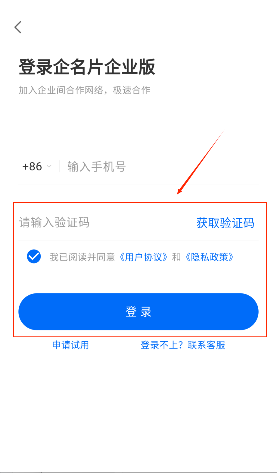 1、打开APP进入登录页,顶部显示时间,中间是"登录企名片企业版"标题,下方需选择+86区号并输入11位手机号呀。