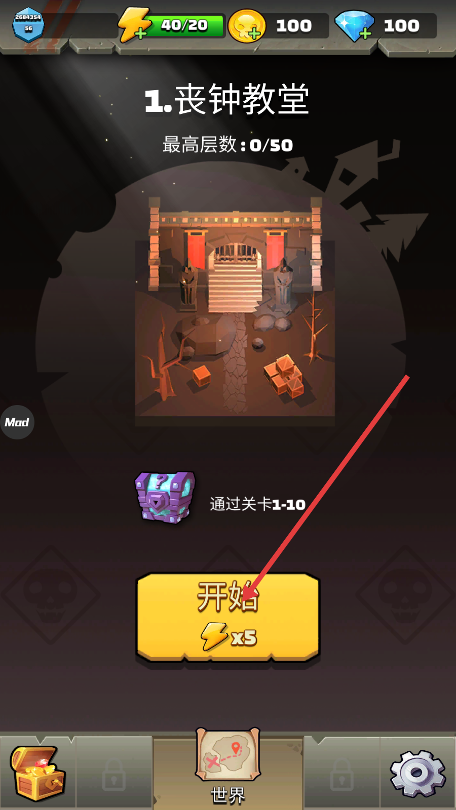 1、挑战【丧钟教堂】前检查资源,点击【开始-x5】进入关卡,推进积累【最高层数-0/50】的进度。