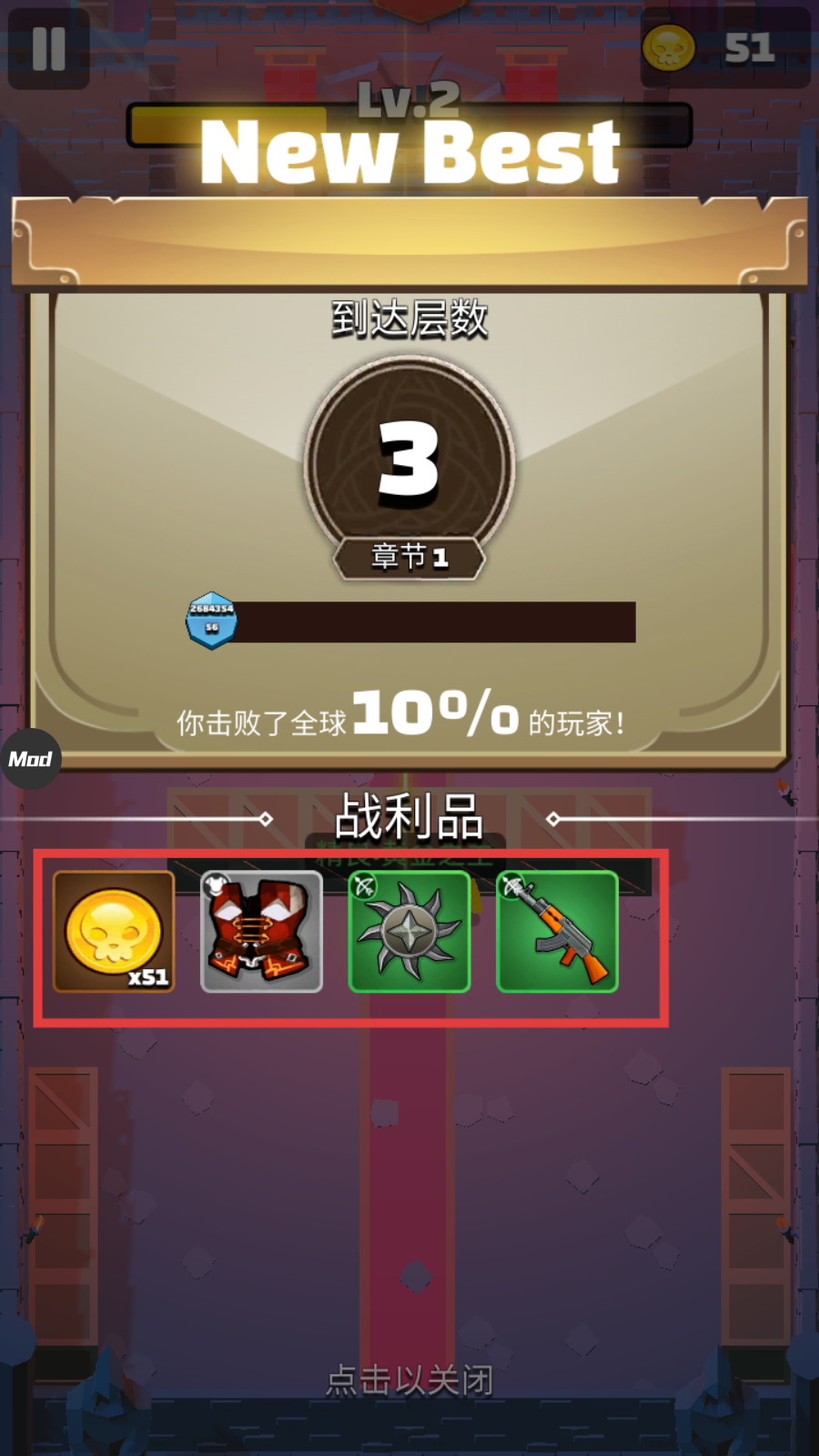 4、结算界面领取【金币-x51】【装备】等战利品,用于强化角色或解锁技能,提升闯关实力。