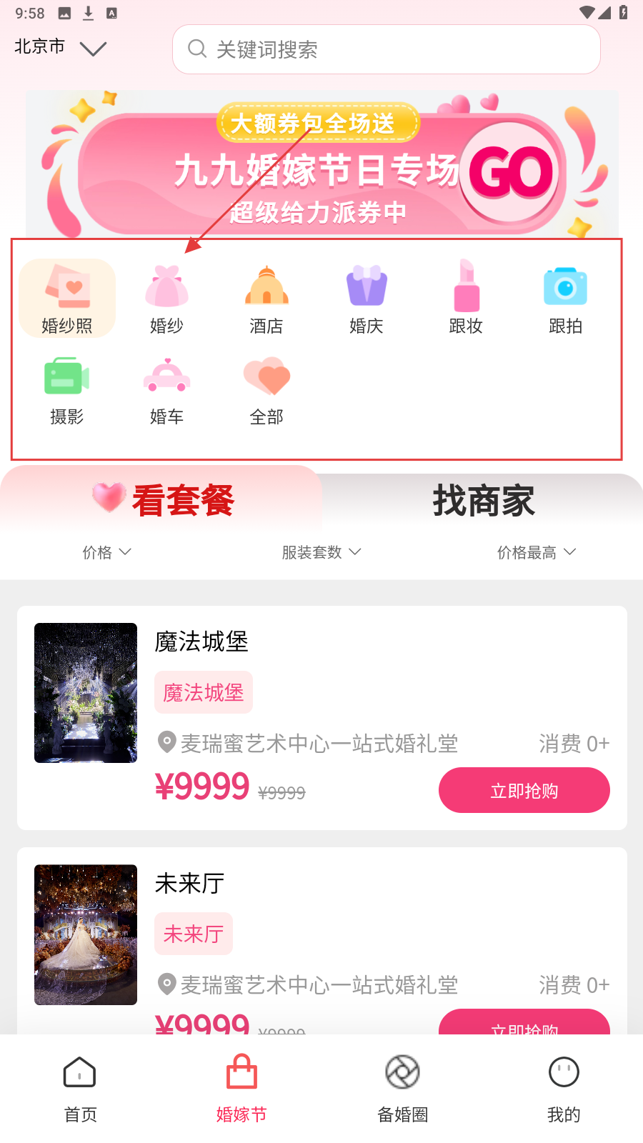 1、打开应用,在【婚嫁节】页面,按需选择要进入的分类,如点击【婚纱】。