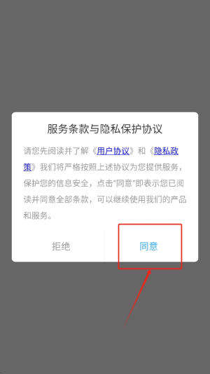 1、接受协议:在弹出的服务条款与隐私保护协议窗口中点击“同意”以接受条款。